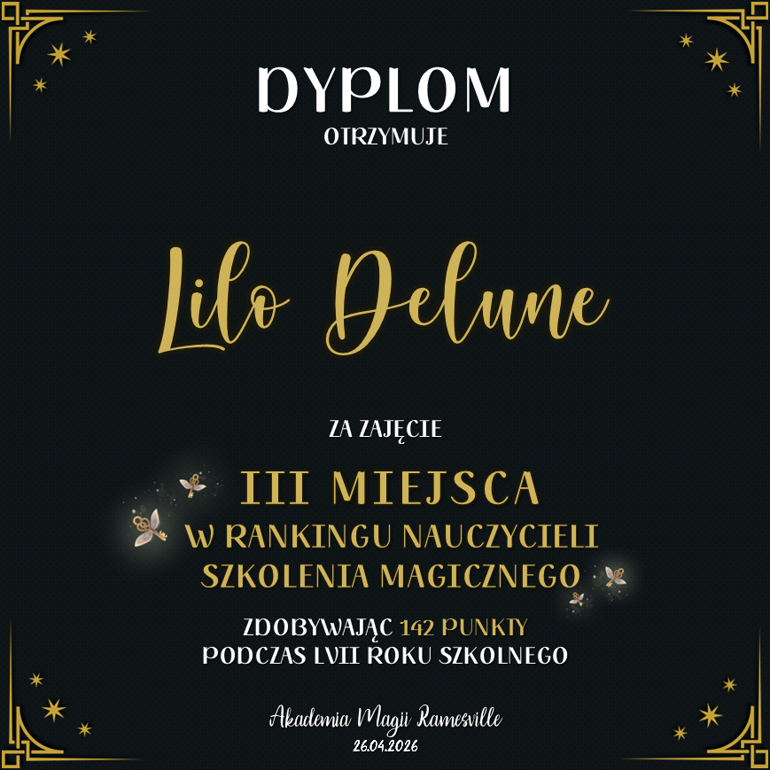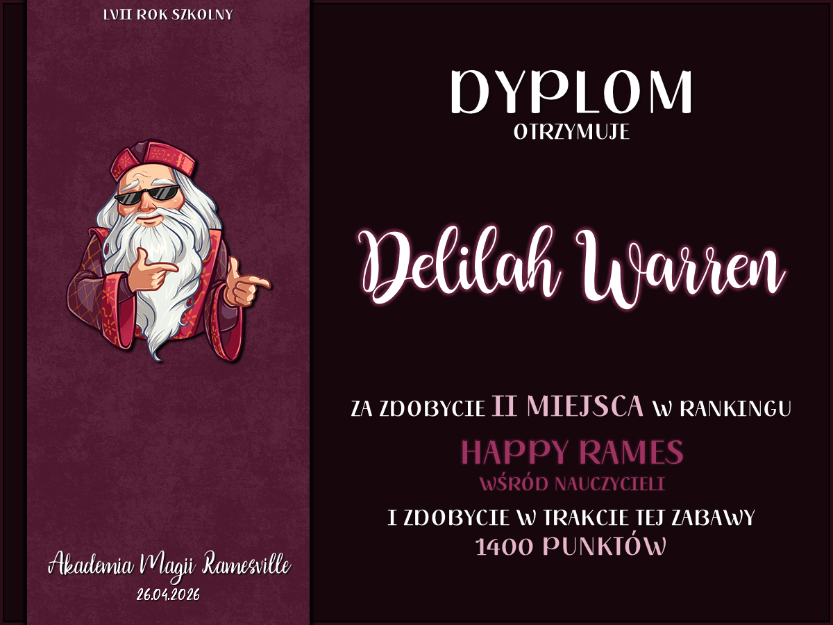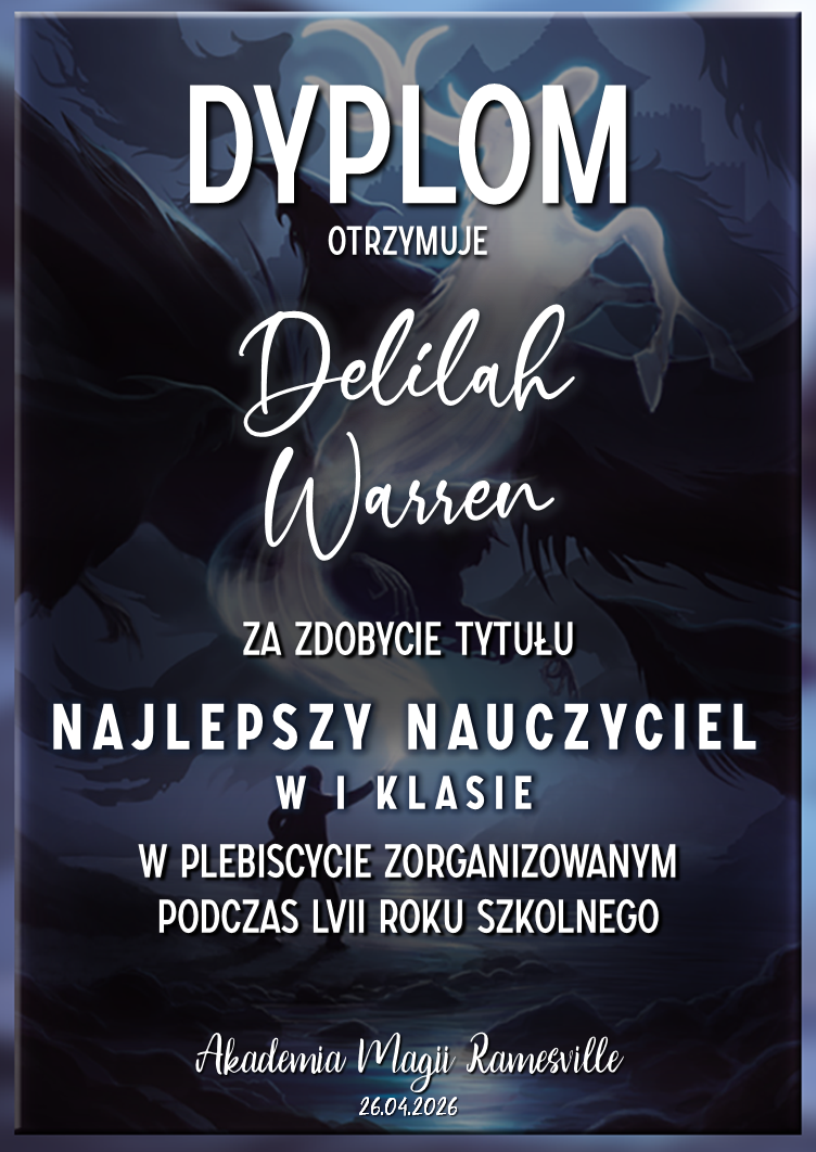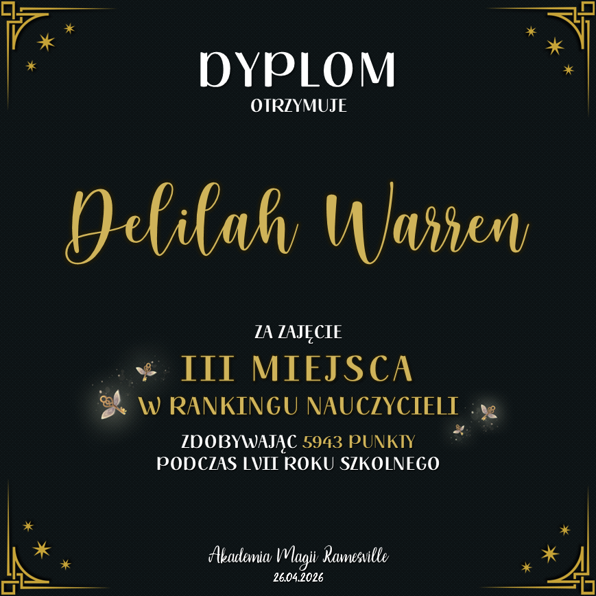 [Profesor Warren zamknięta w sali zaklęć, sprawdzała ostatnie prace uczniów. Co jakiś czas, rzucając smutne spojrzenie na sale lekcyjną. Lunariusz bawił się gumową kością, a gramofon wybrzmiewał ulubioną piosenkę. Delilah wstchnęła, pomyślała, że to najlepsza pora na wystawienie ocen końcowych.]