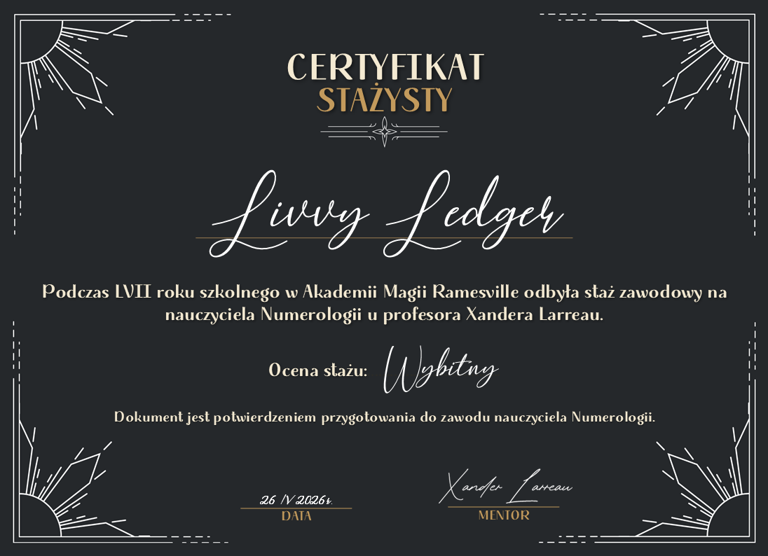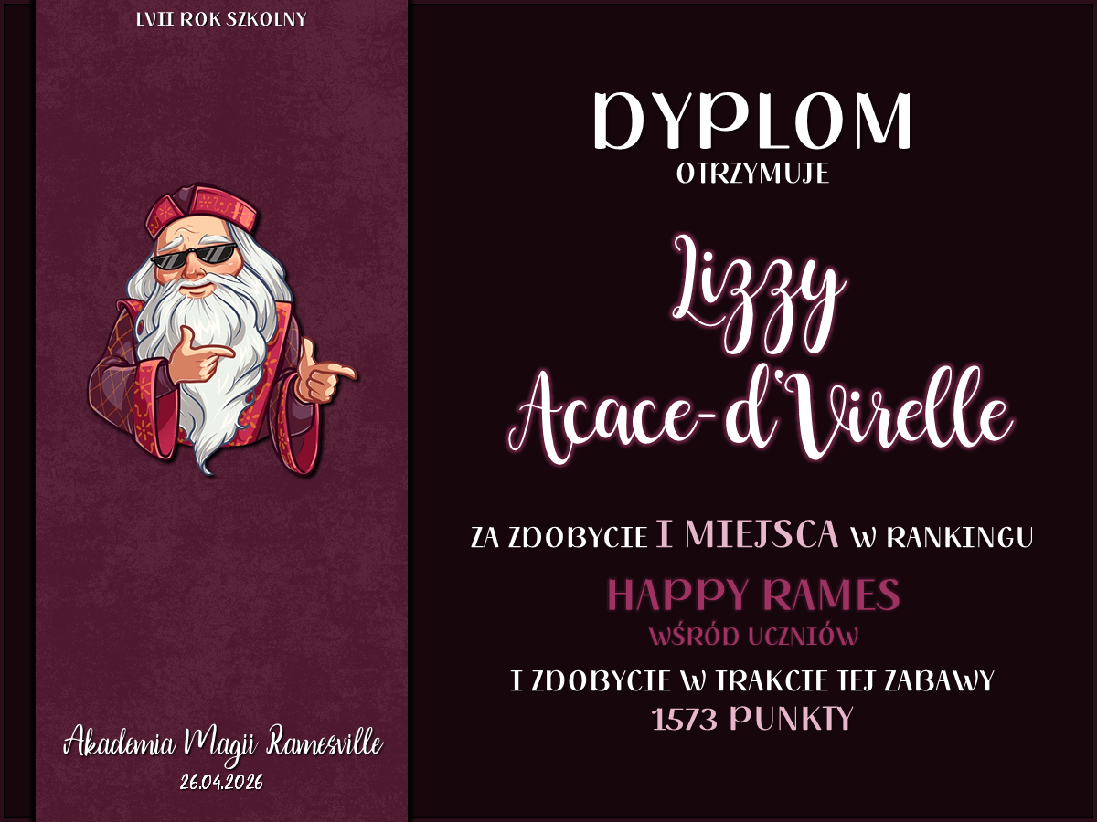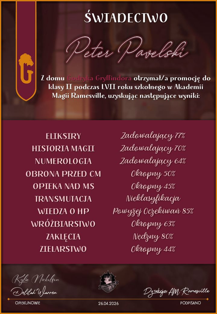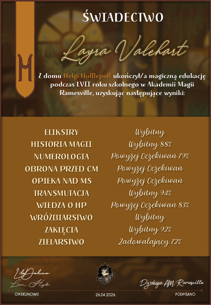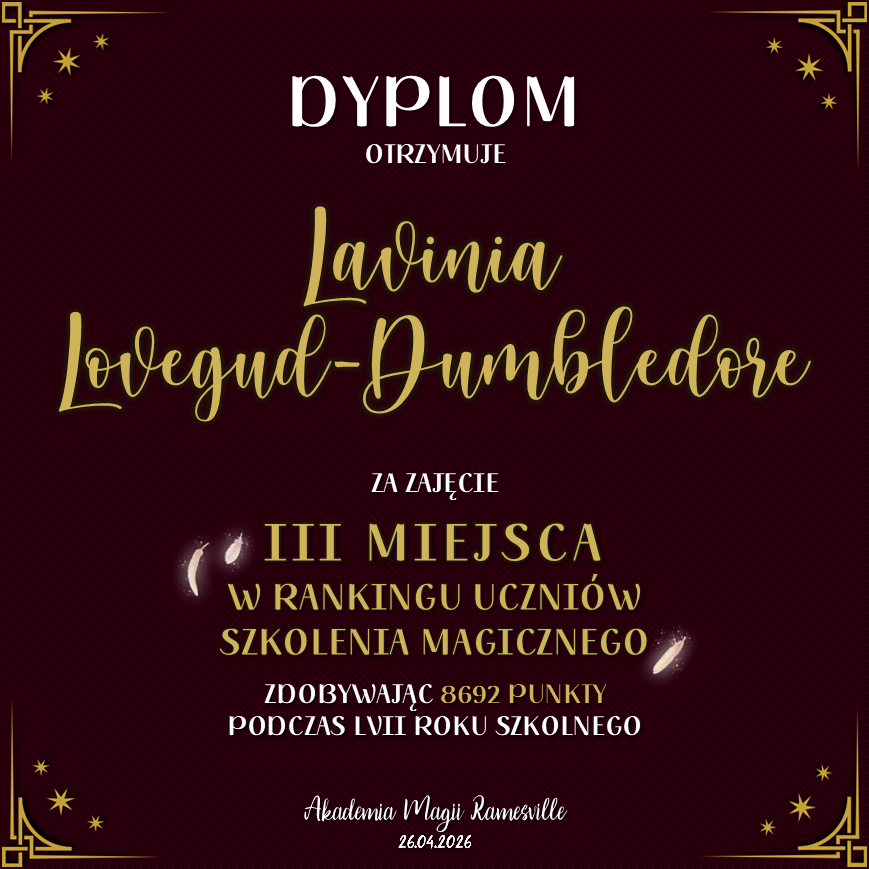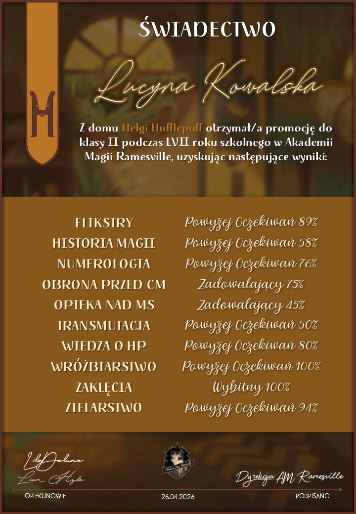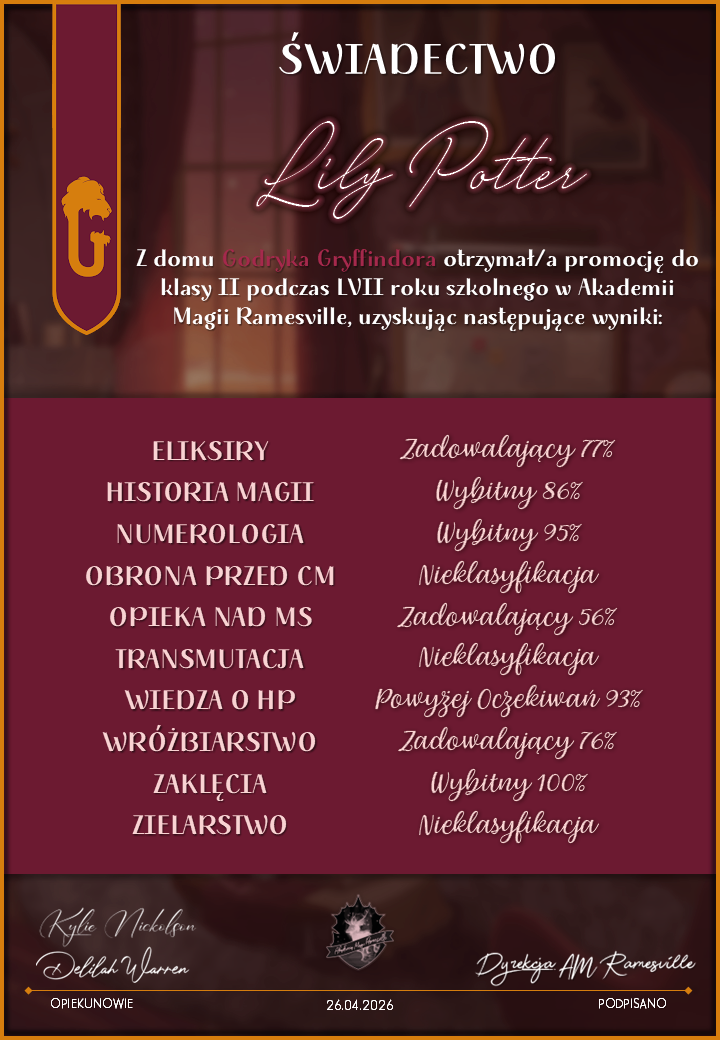 - [G] Lily Potter - Wybitny (śr. 6,0 spr. 100%)