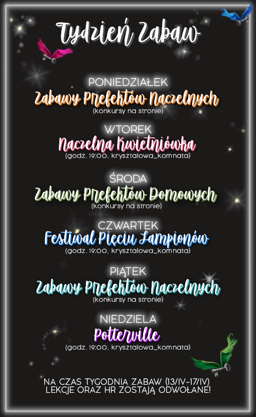 Przypominamy, że od jutra rozpocznie się Tydzień Zabaw. Podczas tego wydarzenia czeka na Was wiele atrakcji, punktów i galeonów. Więcej informacji znajdziecie w newsie z rozpiską zabaw i konkursów.