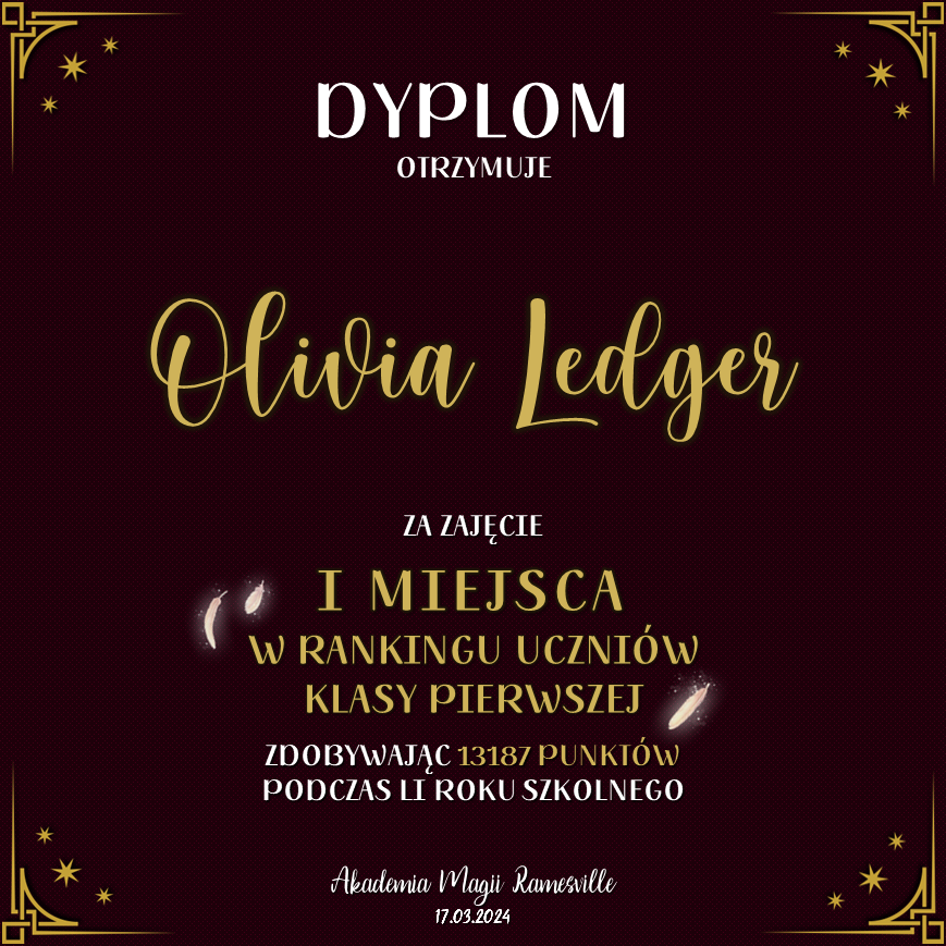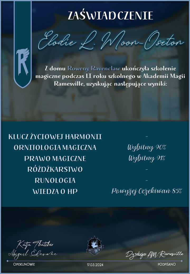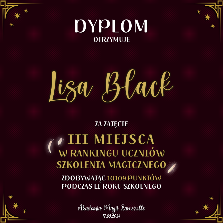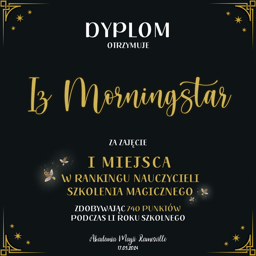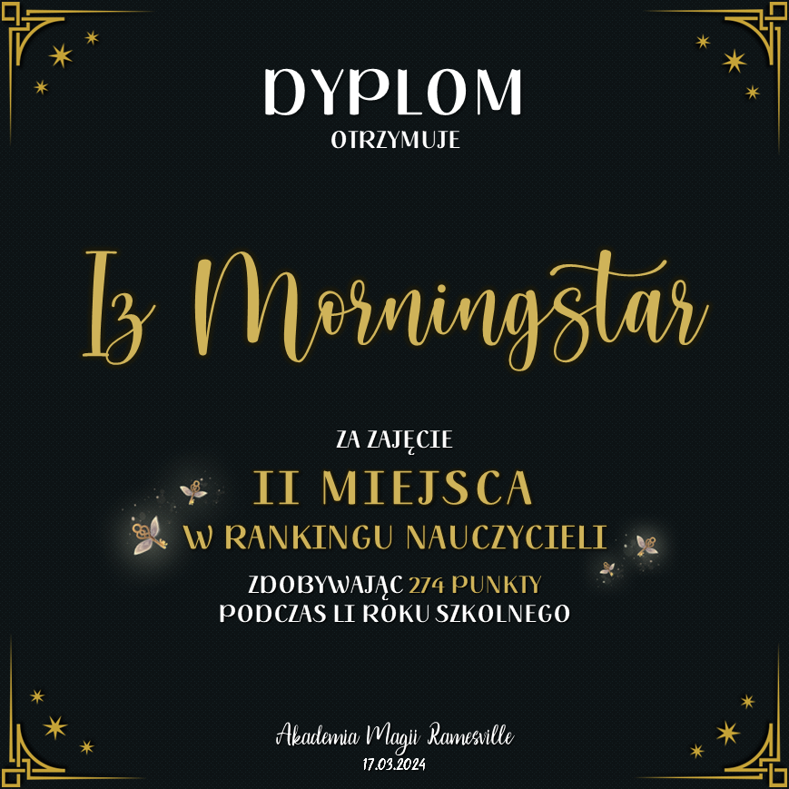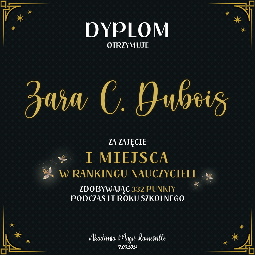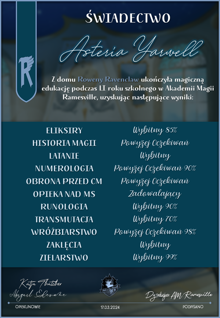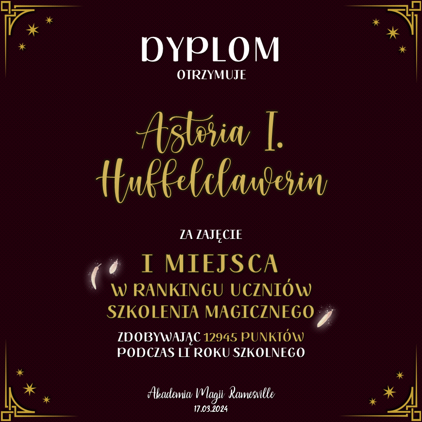 Wczoraj o godzinie 1900 odbyło się uroczyste zakończenie LI roku szkolnego. Dziękujemy za to, że tak wiele osób przyszło, aby pożegnać kolejny rok w Akademii Magii Ramesville. Poniżej znajduje się podsumowanie tego wydarzenia, zaś po kliknięciu w wybrane nazwisko wyświetli się dyplom. Oprócz tego w ciągu najbliższych kilku dni Izba Pamięci zostanie zaktualizowana.
