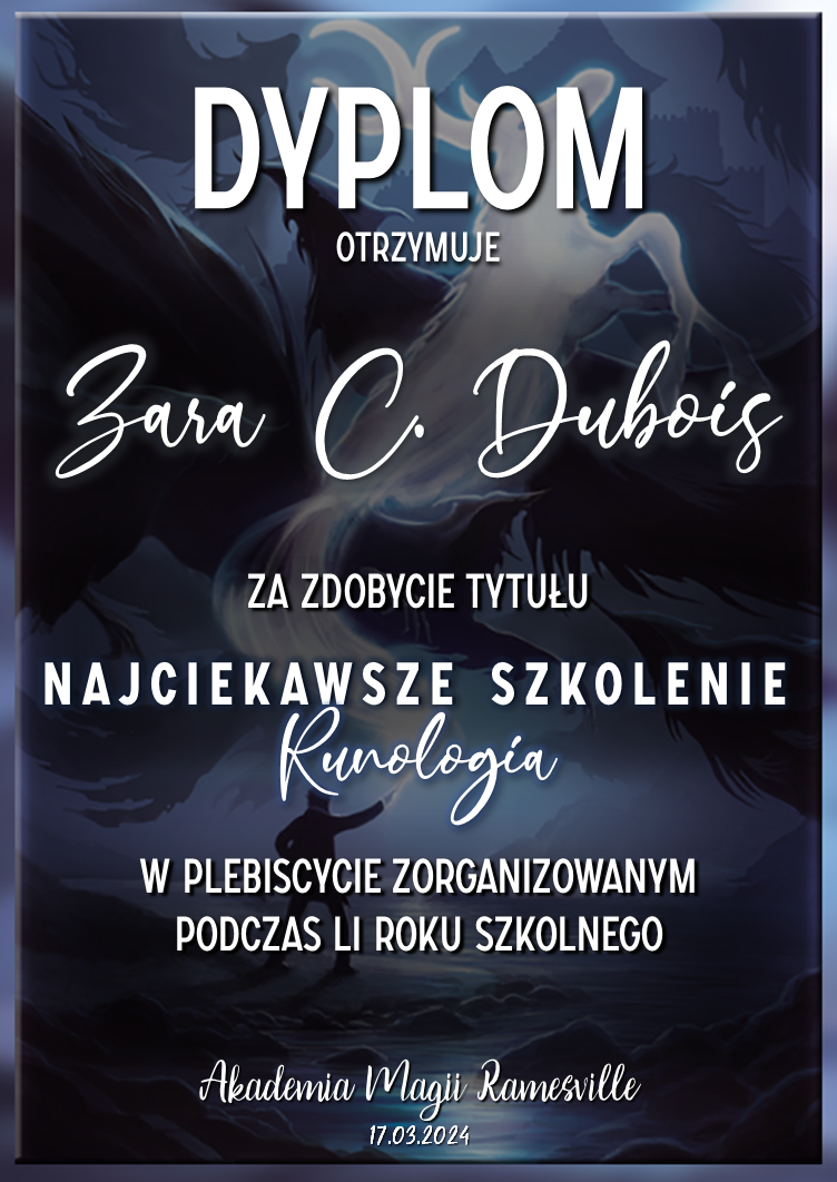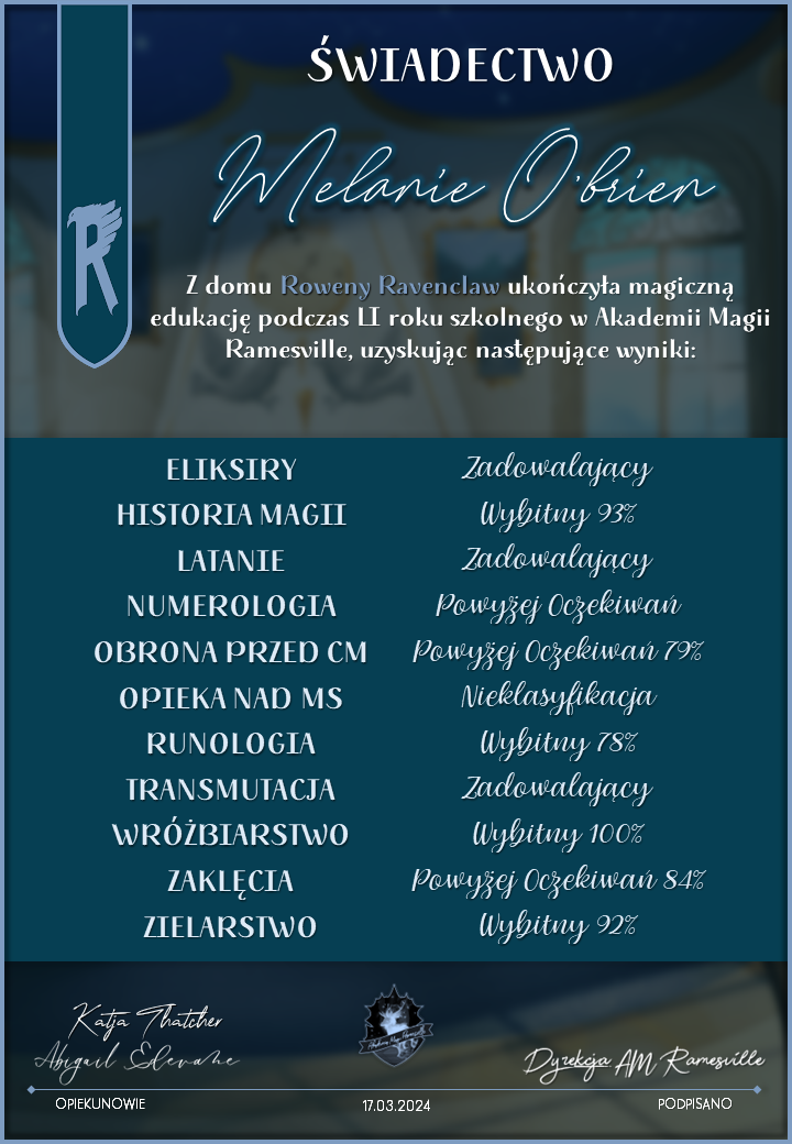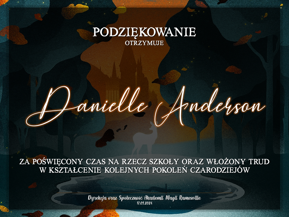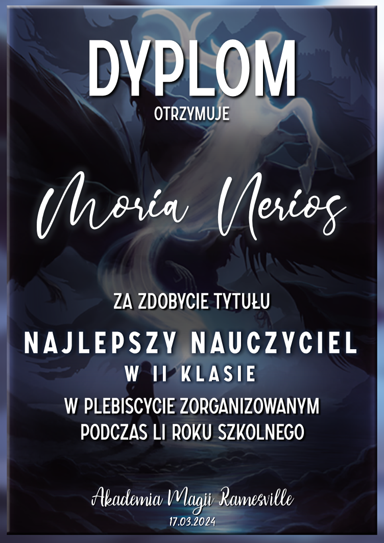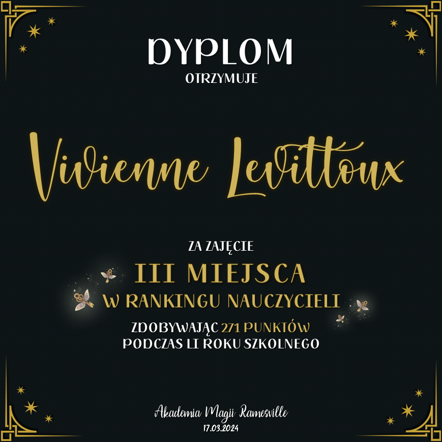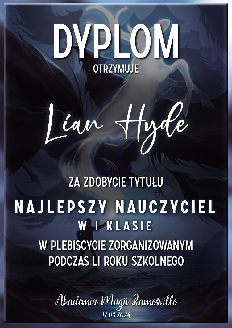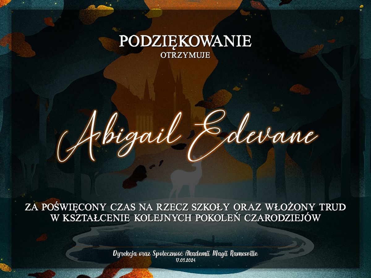 Wczoraj o godzinie 1900 odbyło się uroczyste zakończenie LI roku szkolnego. Dziękujemy za to, że tak wiele osób przyszło, aby pożegnać kolejny rok w Akademii Magii Ramesville. Poniżej znajduje się podsumowanie tego wydarzenia, zaś po kliknięciu w wybrane nazwisko wyświetli się dyplom. Oprócz tego w ciągu najbliższych kilku dni Izba Pamięci zostanie zaktualizowana.