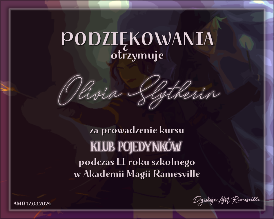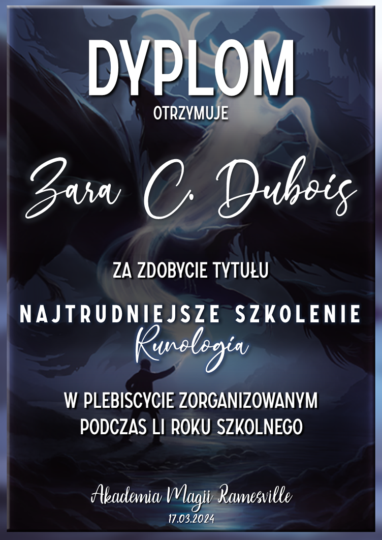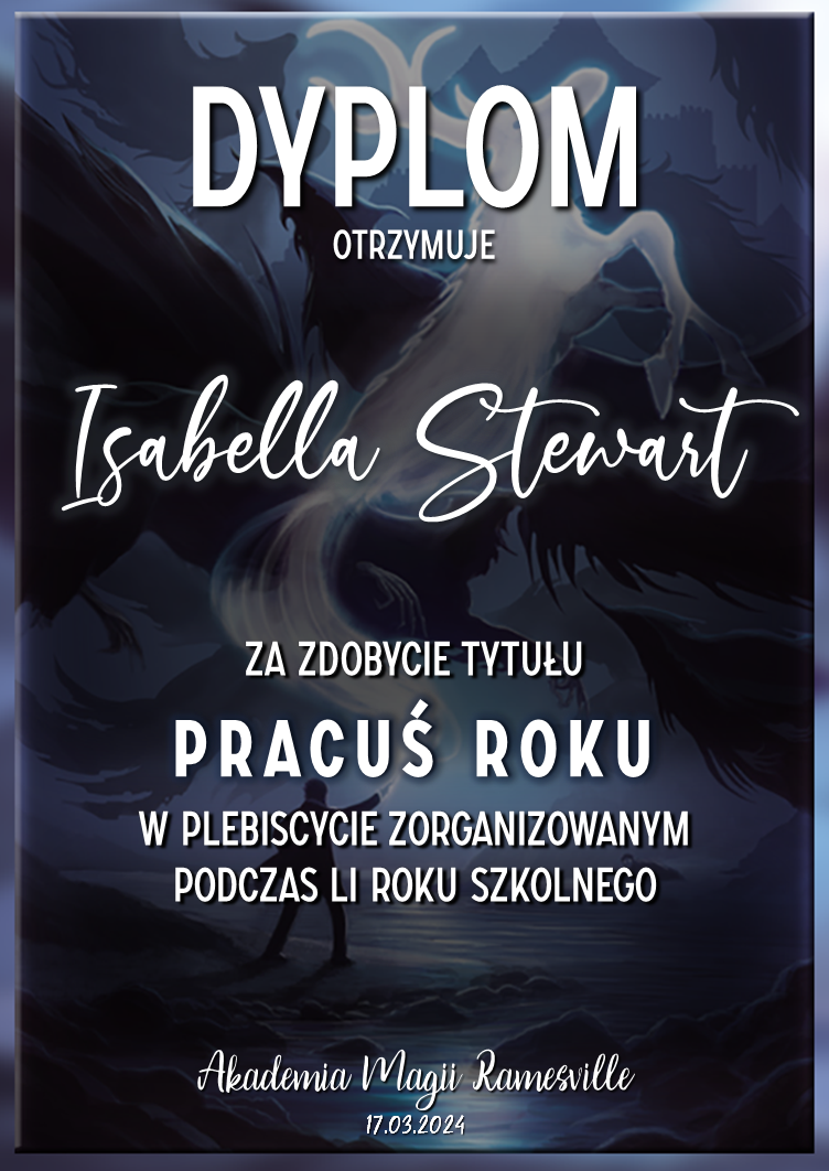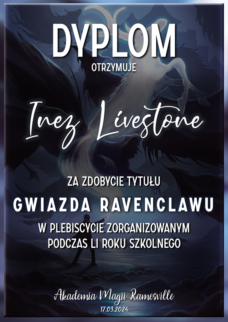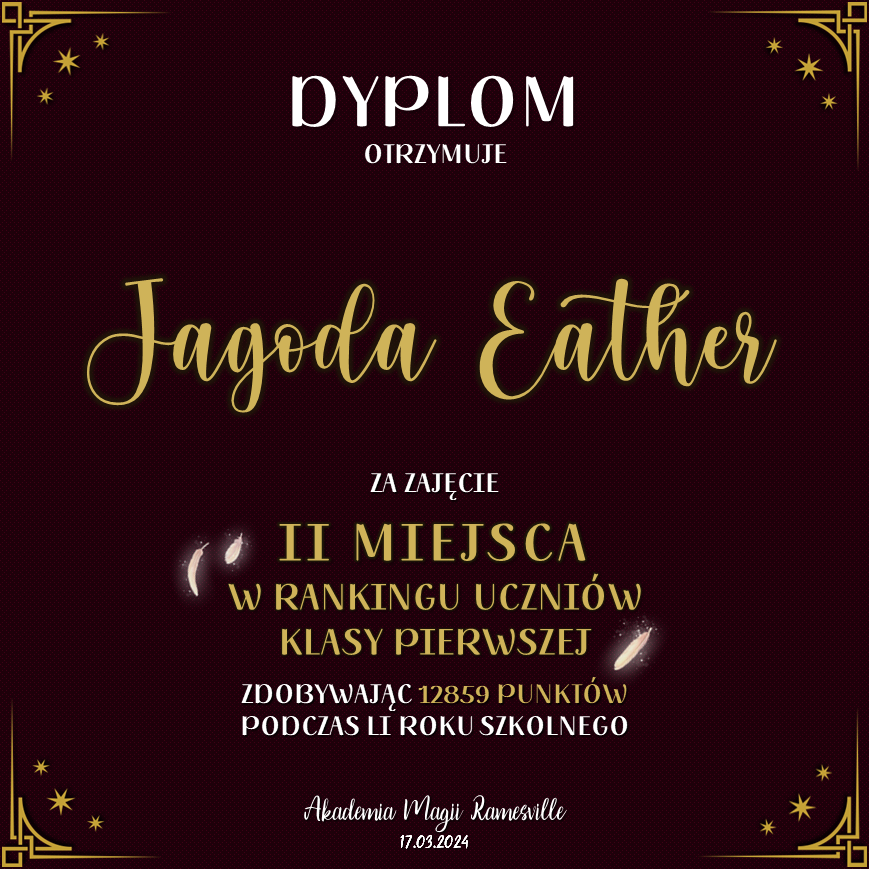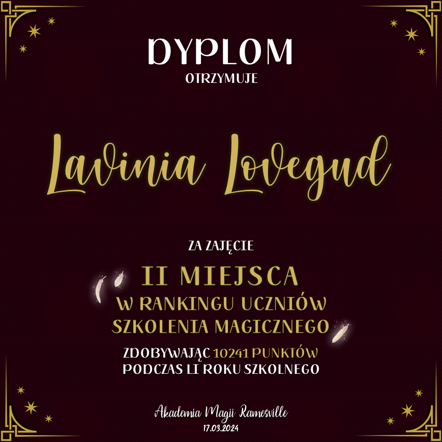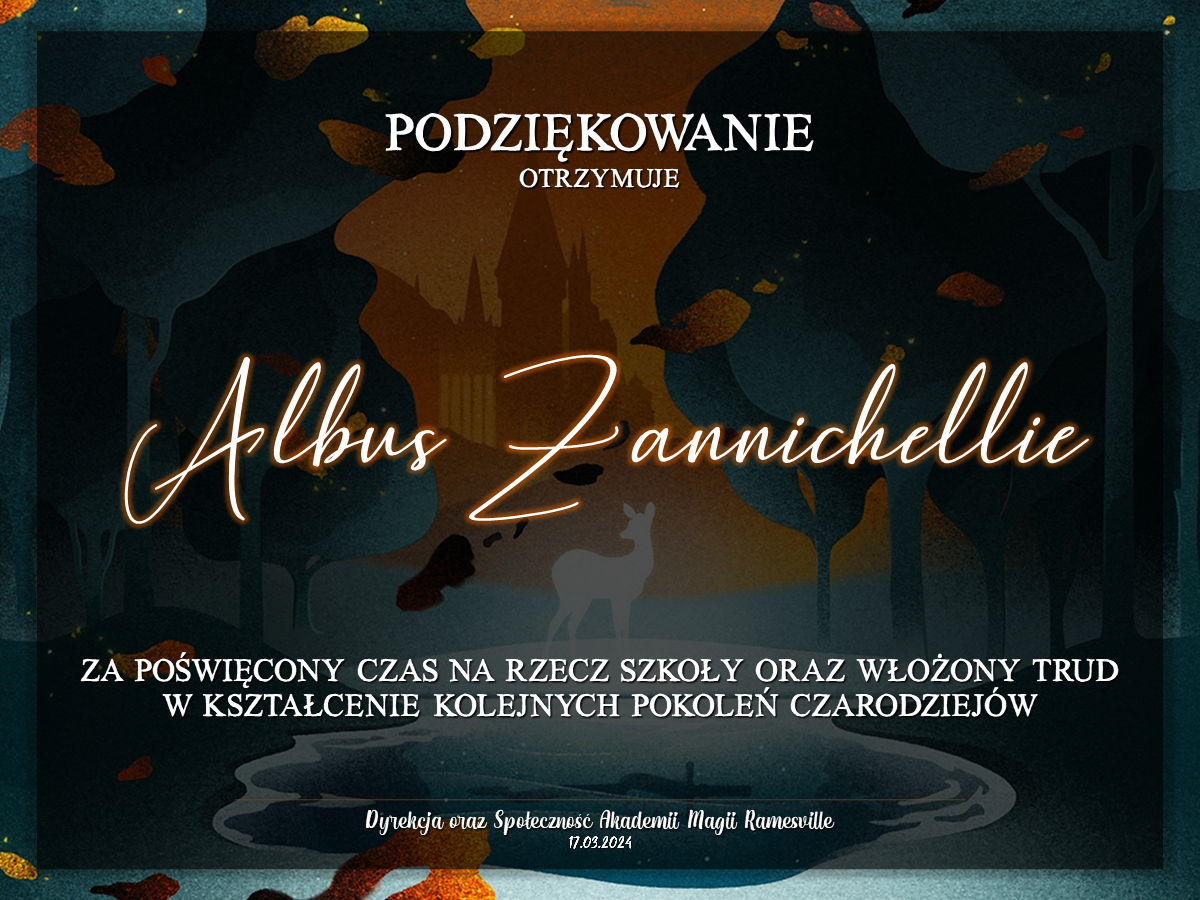 Wczoraj o godzinie 1900 odbyło się uroczyste zakończenie LI roku szkolnego. Dziękujemy za to, że tak wiele osób przyszło, aby pożegnać kolejny rok w Akademii Magii Ramesville. Poniżej znajduje się podsumowanie tego wydarzenia, zaś po kliknięciu w wybrane nazwisko wyświetli się dyplom. Oprócz tego w ciągu najbliższych kilku dni Izba Pamięci zostanie zaktualizowana.
