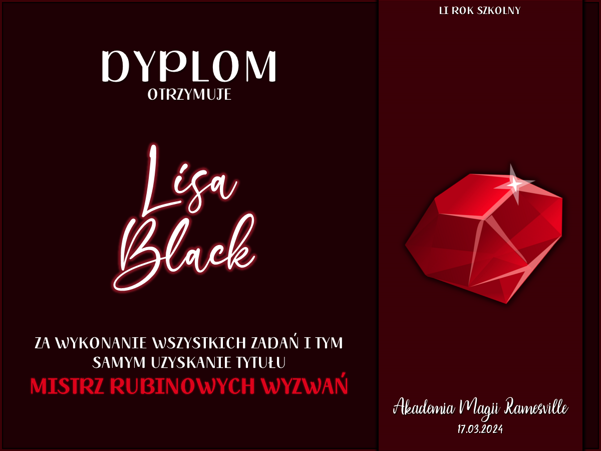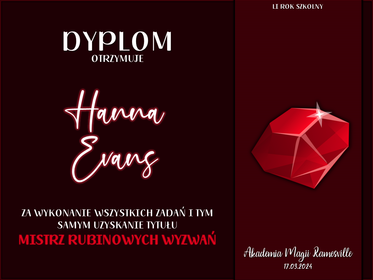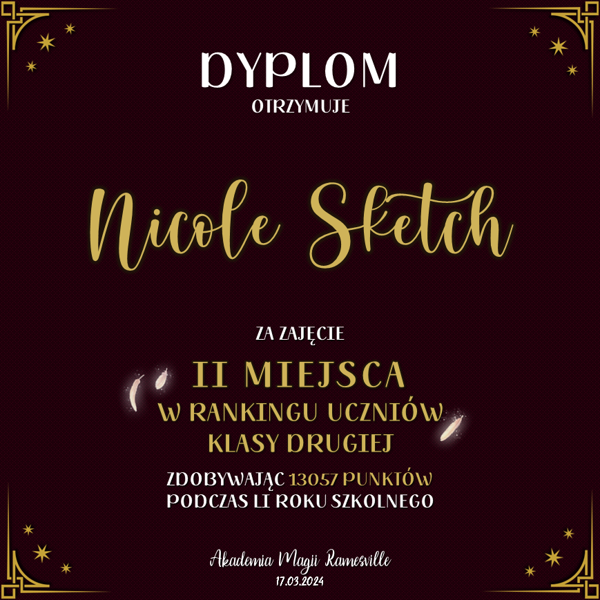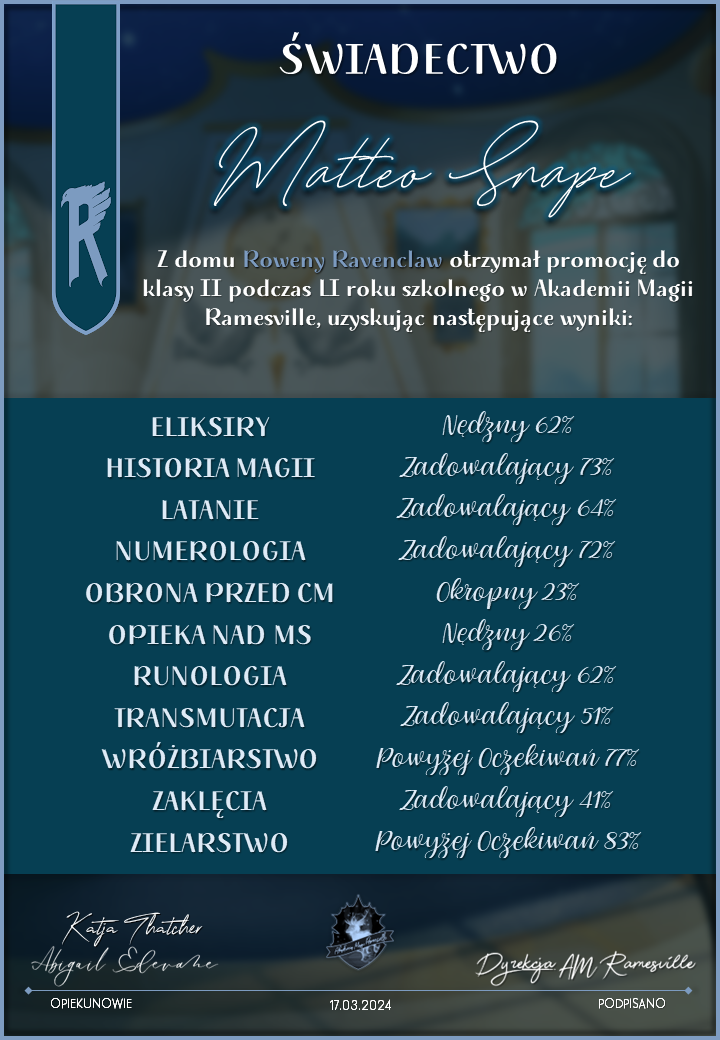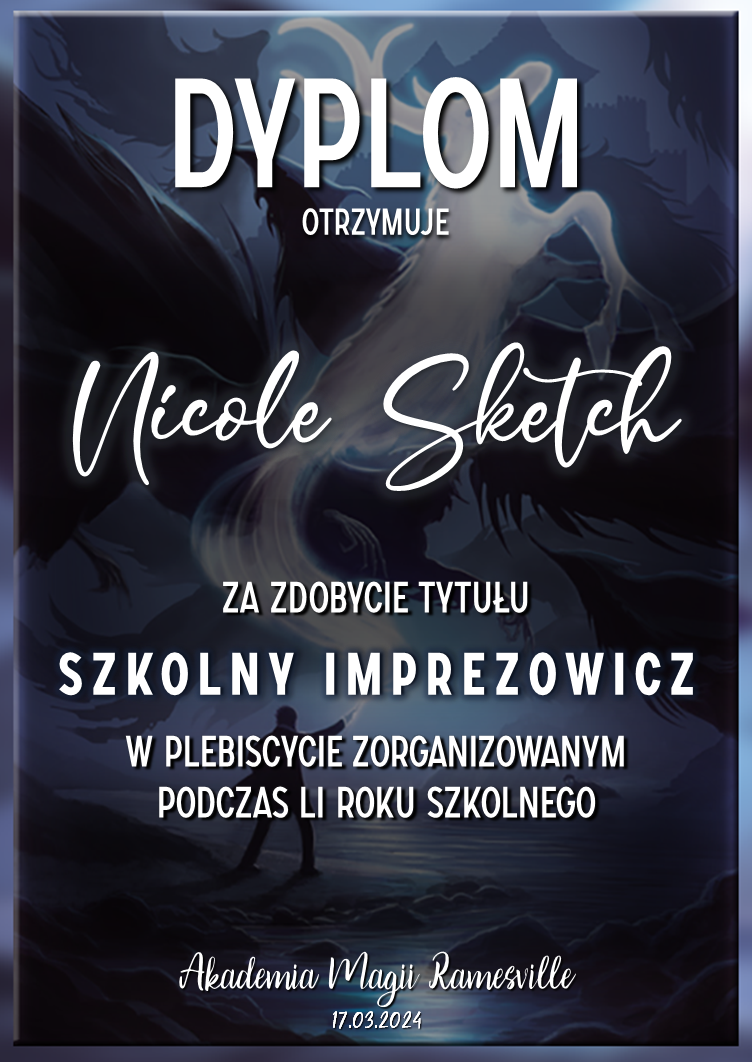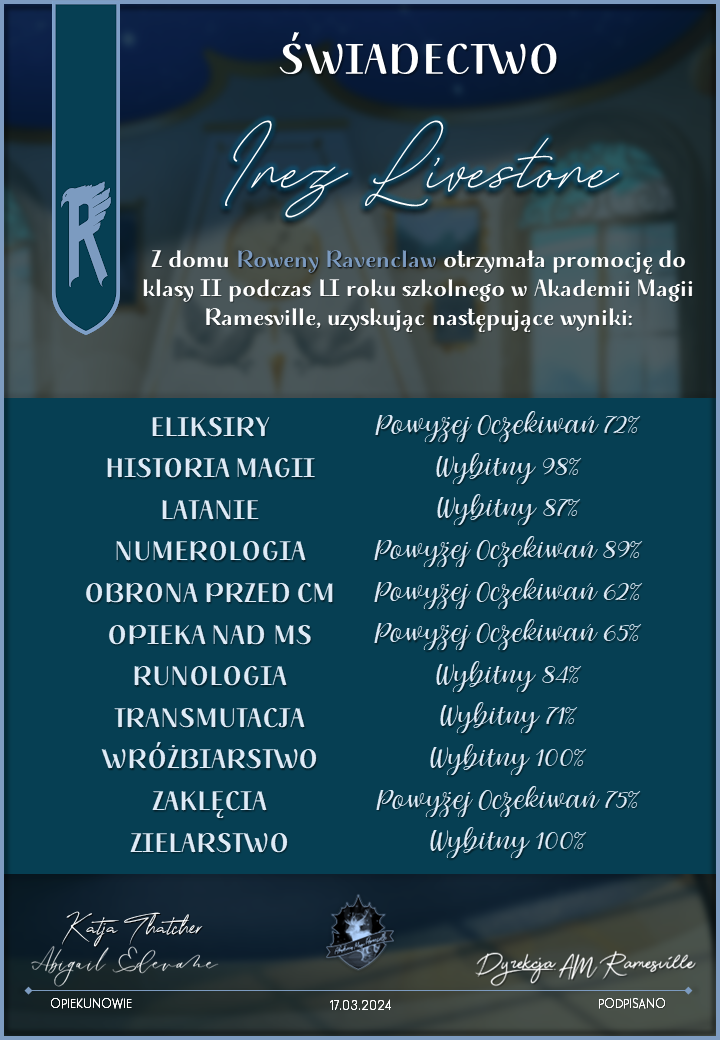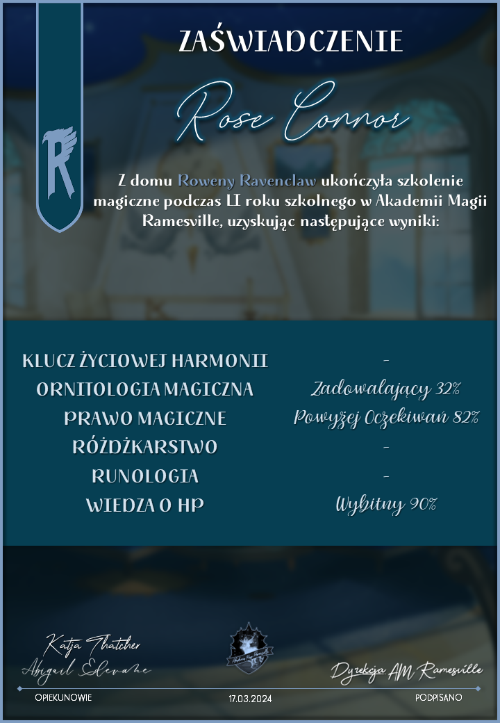 Wczoraj o godzinie 1900 odbyło się uroczyste zakończenie LI roku szkolnego. Dziękujemy za to, że tak wiele osób przyszło, aby pożegnać kolejny rok w Akademii Magii Ramesville. Poniżej znajduje się podsumowanie tego wydarzenia, zaś po kliknięciu w wybrane nazwisko wyświetli się dyplom. Oprócz tego w ciągu najbliższych kilku dni Izba Pamięci zostanie zaktualizowana.