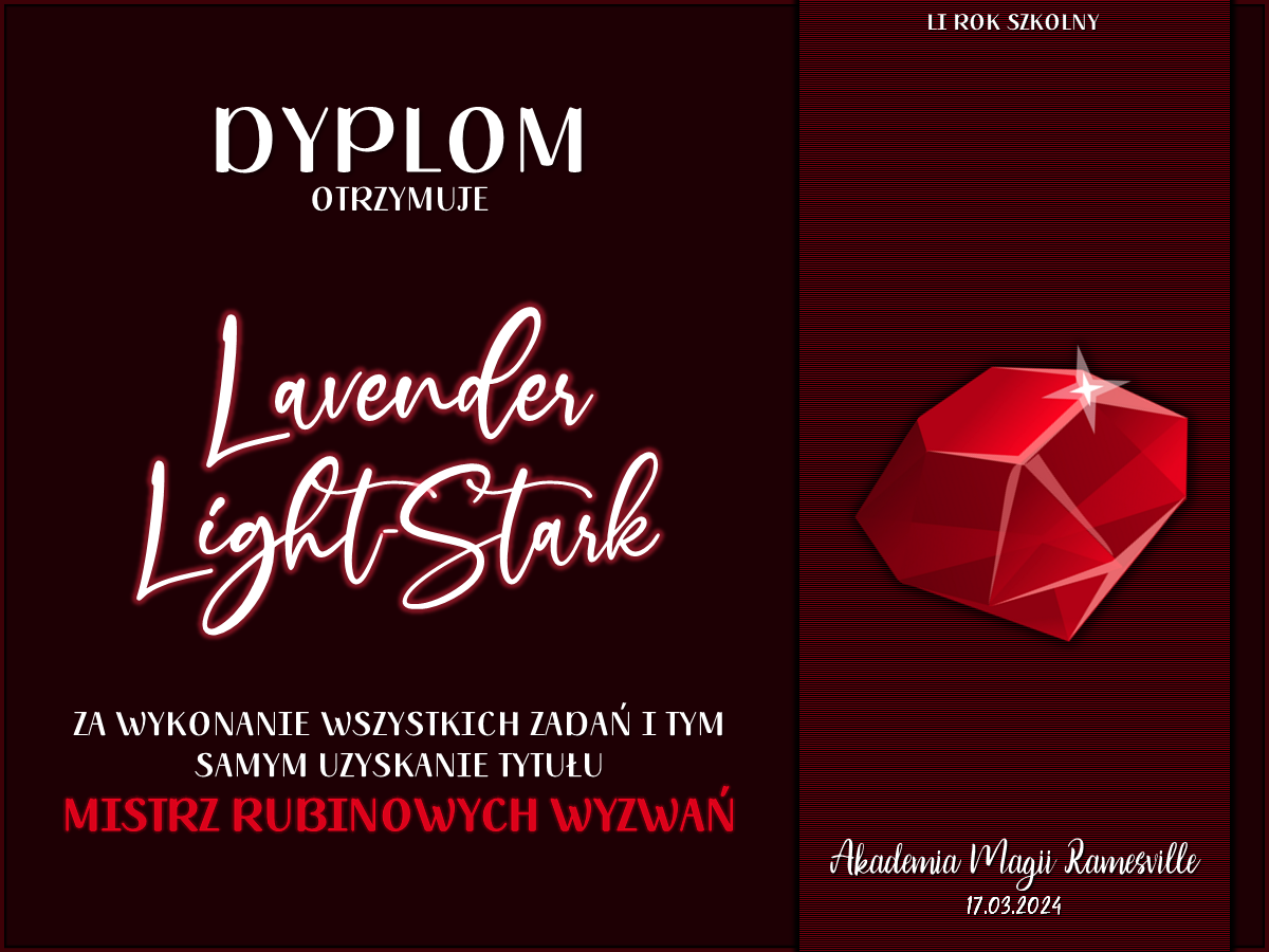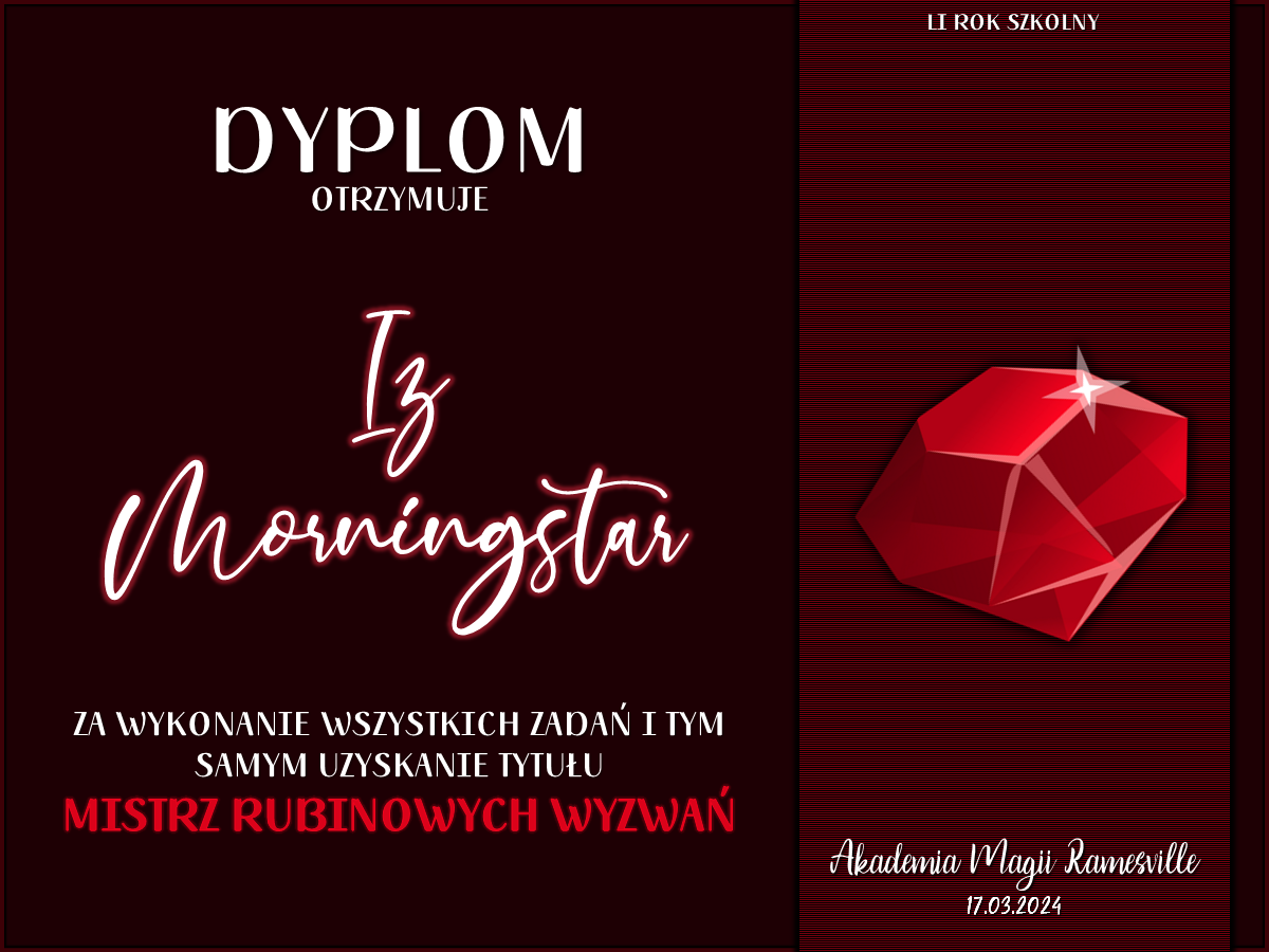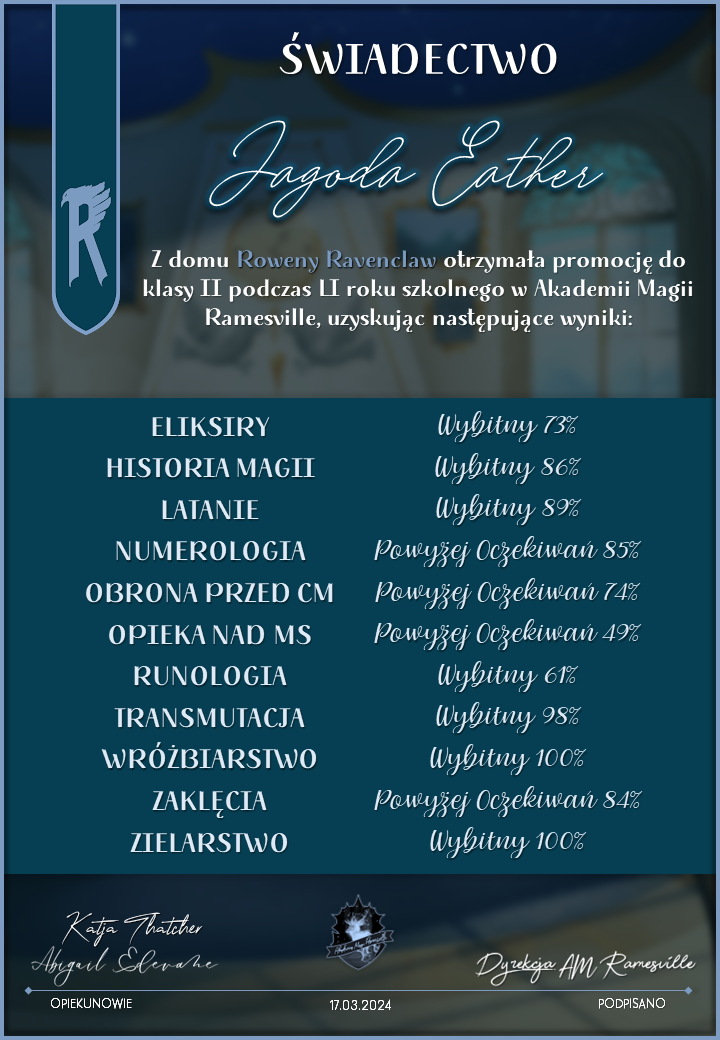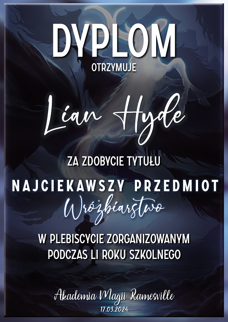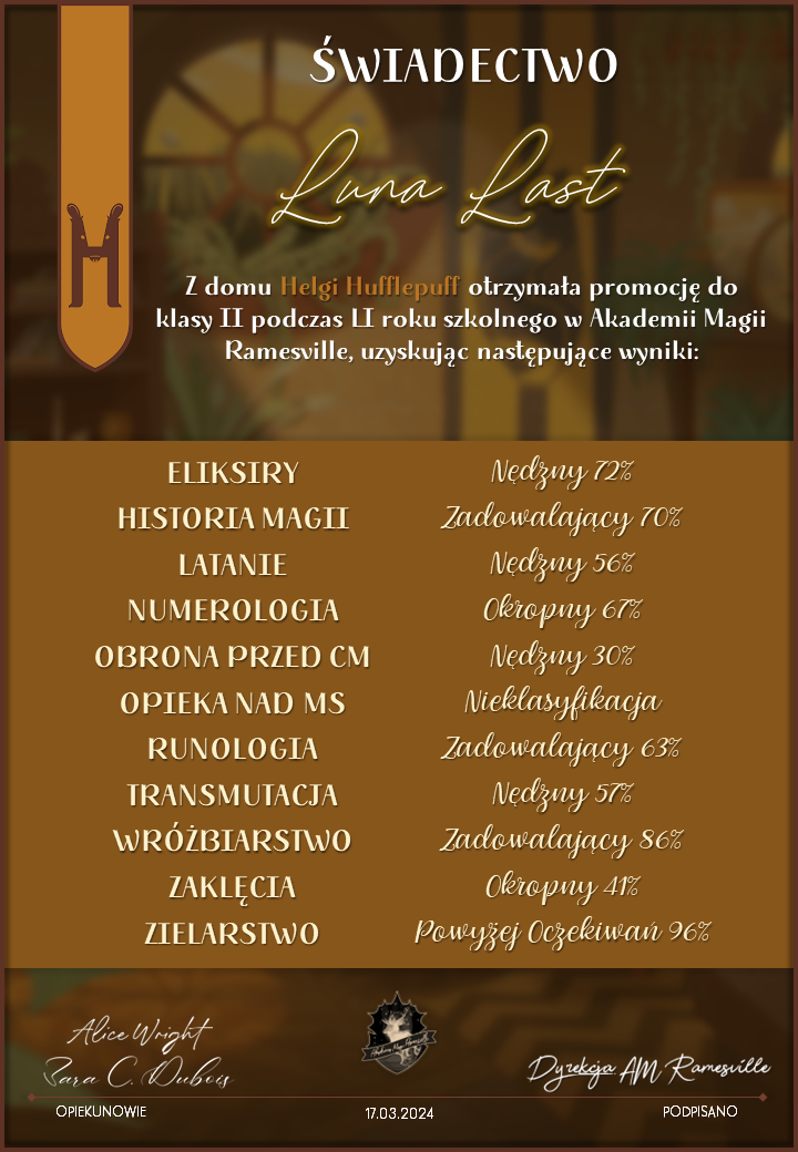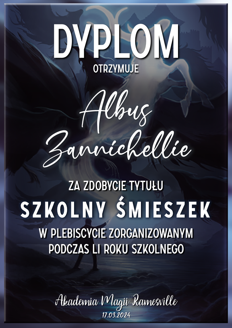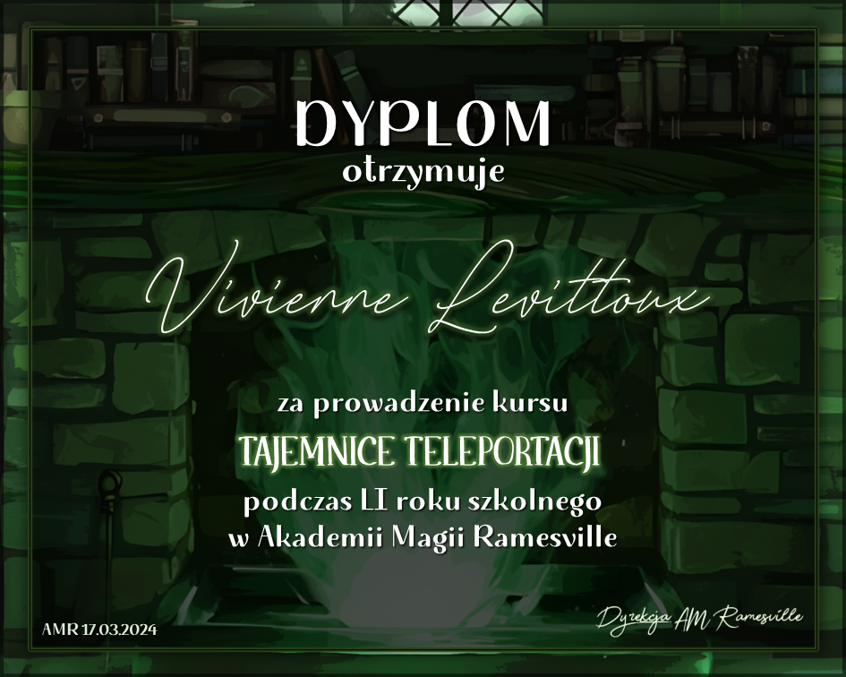 Wczoraj o godzinie 1900 odbyło się uroczyste zakończenie LI roku szkolnego. Dziękujemy za to, że tak wiele osób przyszło, aby pożegnać kolejny rok w Akademii Magii Ramesville. Poniżej znajduje się podsumowanie tego wydarzenia, zaś po kliknięciu w wybrane nazwisko wyświetli się dyplom. Oprócz tego w ciągu najbliższych kilku dni Izba Pamięci zostanie zaktualizowana.