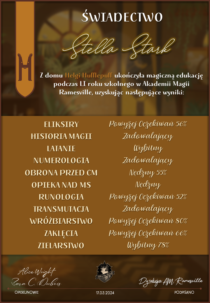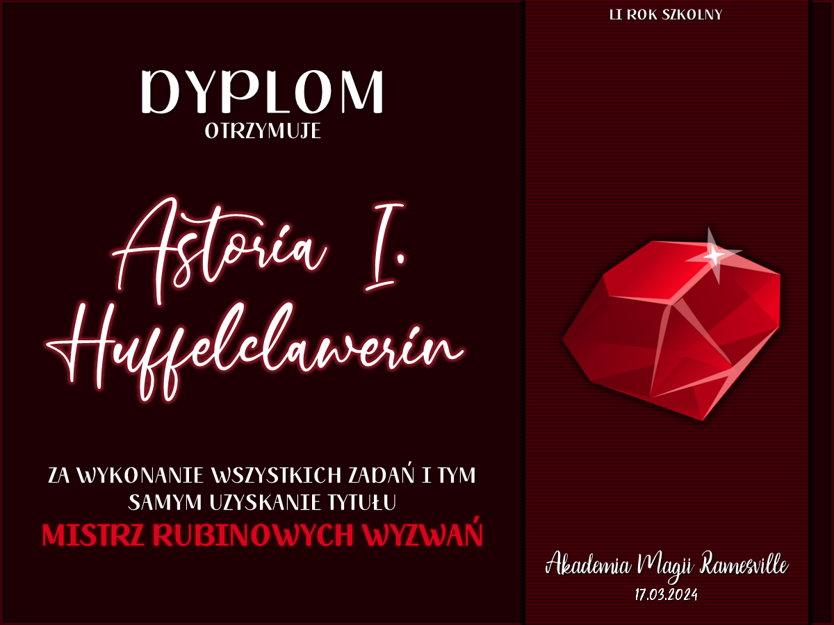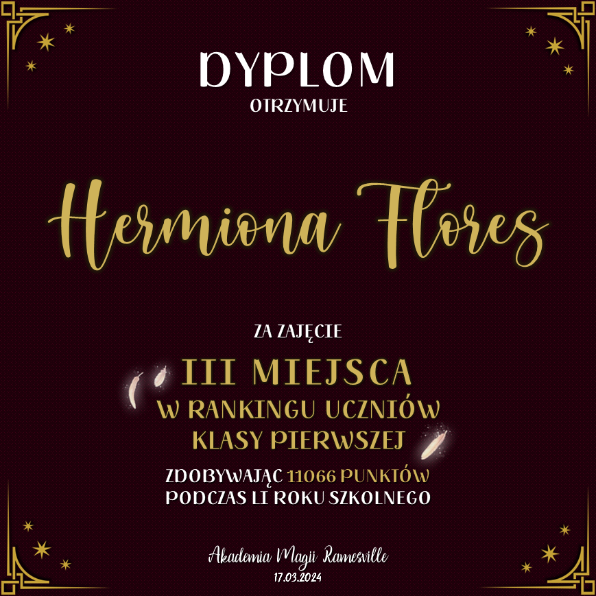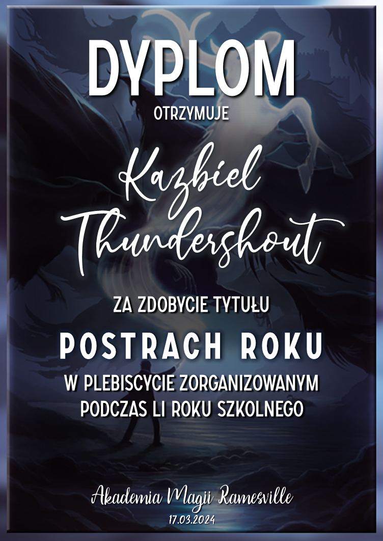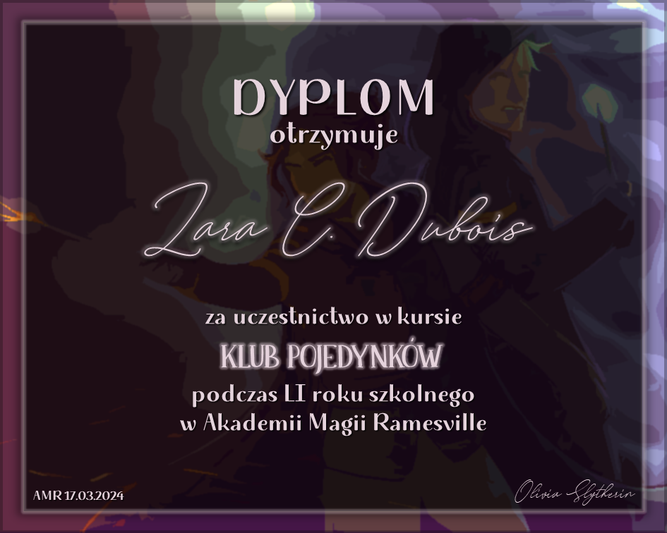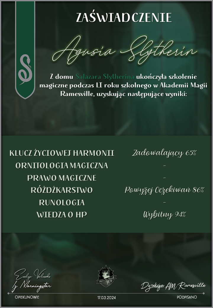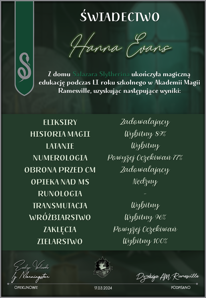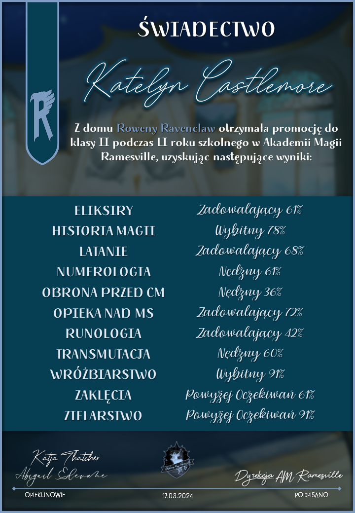 Wczoraj o godzinie 1900 odbyło się uroczyste zakończenie LI roku szkolnego. Dziękujemy za to, że tak wiele osób przyszło, aby pożegnać kolejny rok w Akademii Magii Ramesville. Poniżej znajduje się podsumowanie tego wydarzenia, zaś po kliknięciu w wybrane nazwisko wyświetli się dyplom. Oprócz tego w ciągu najbliższych kilku dni Izba Pamięci zostanie zaktualizowana.