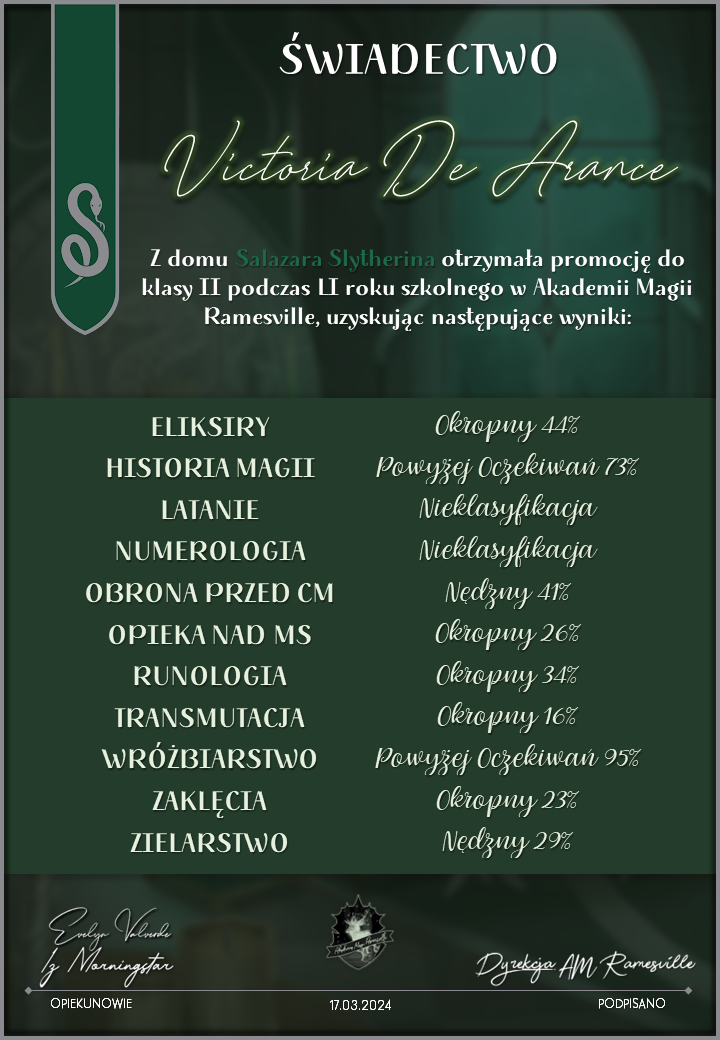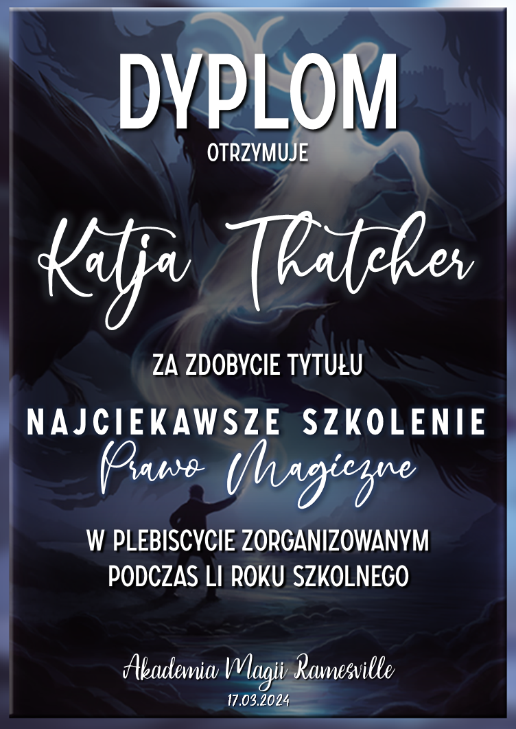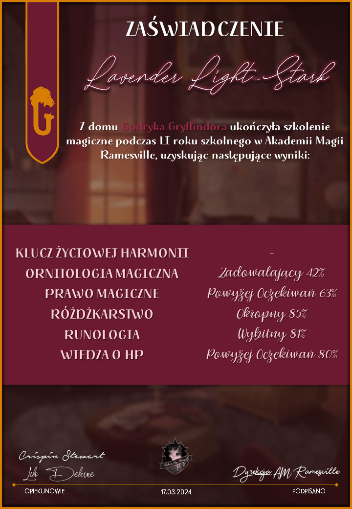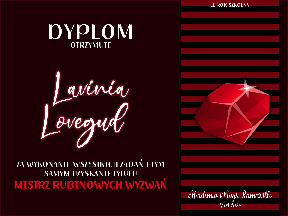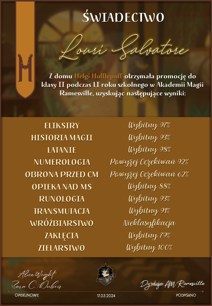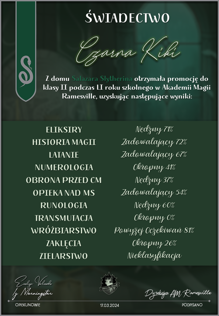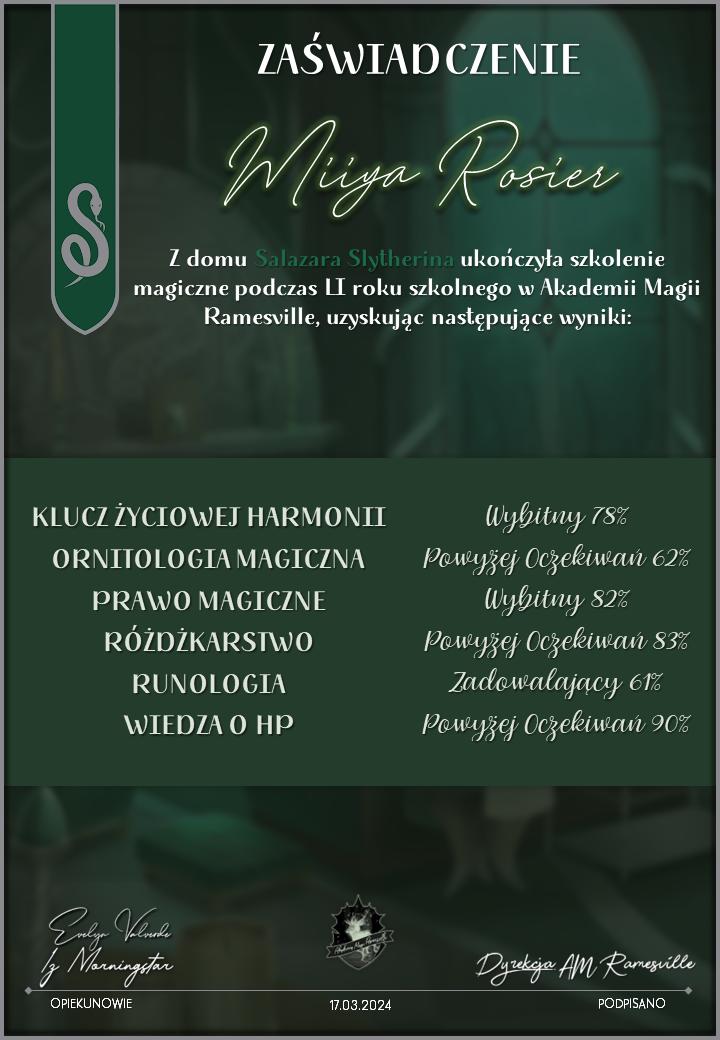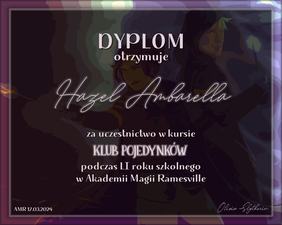 Wczoraj o godzinie 1900 odbyło się uroczyste zakończenie LI roku szkolnego. Dziękujemy za to, że tak wiele osób przyszło, aby pożegnać kolejny rok w Akademii Magii Ramesville. Poniżej znajduje się podsumowanie tego wydarzenia, zaś po kliknięciu w wybrane nazwisko wyświetli się dyplom. Oprócz tego w ciągu najbliższych kilku dni Izba Pamięci zostanie zaktualizowana.