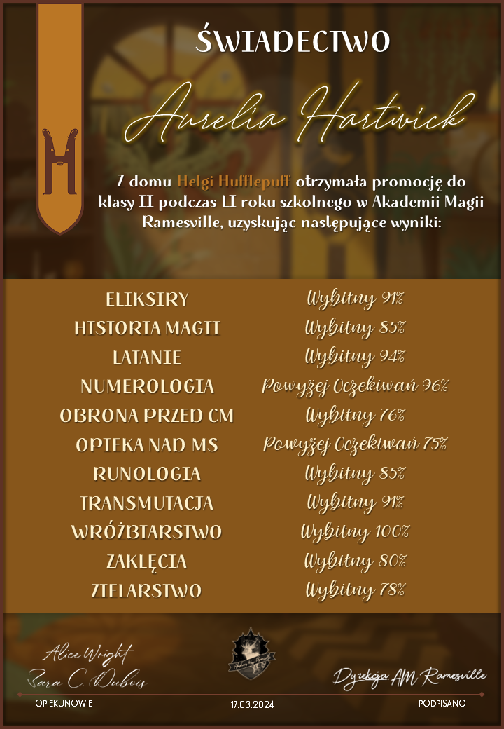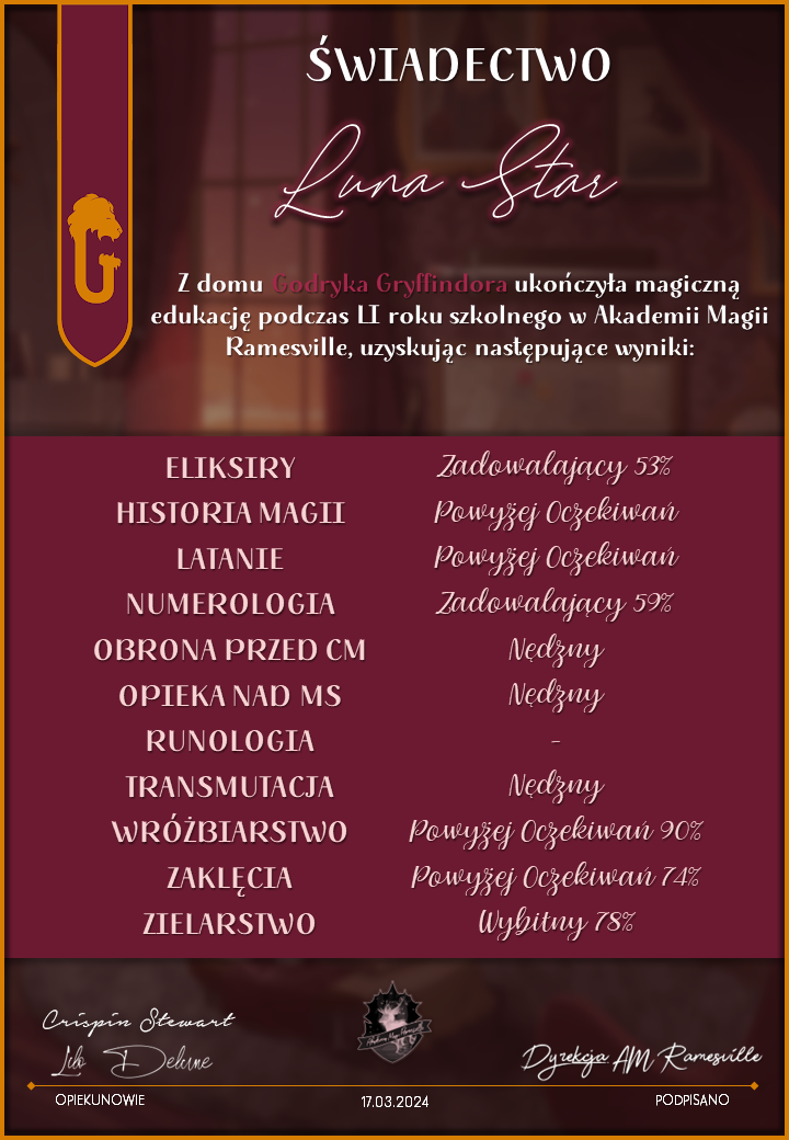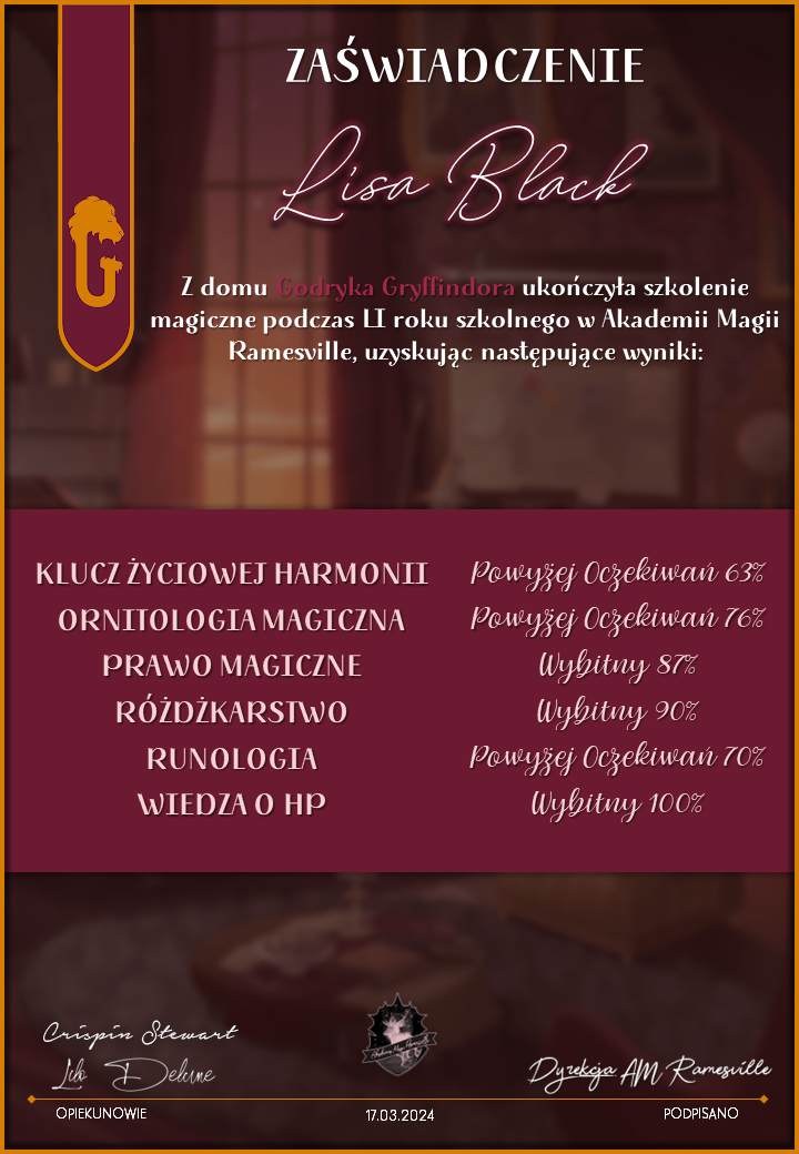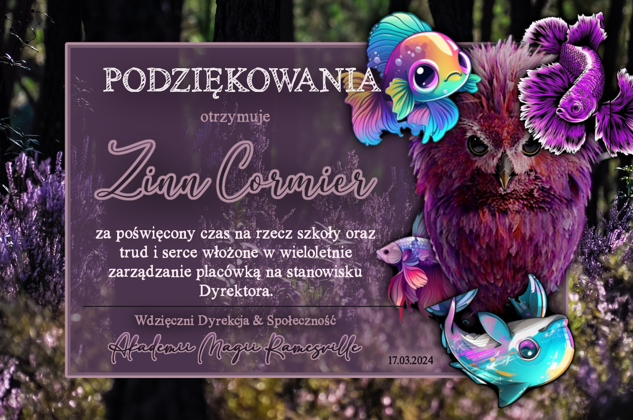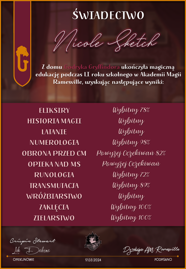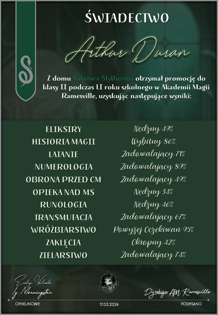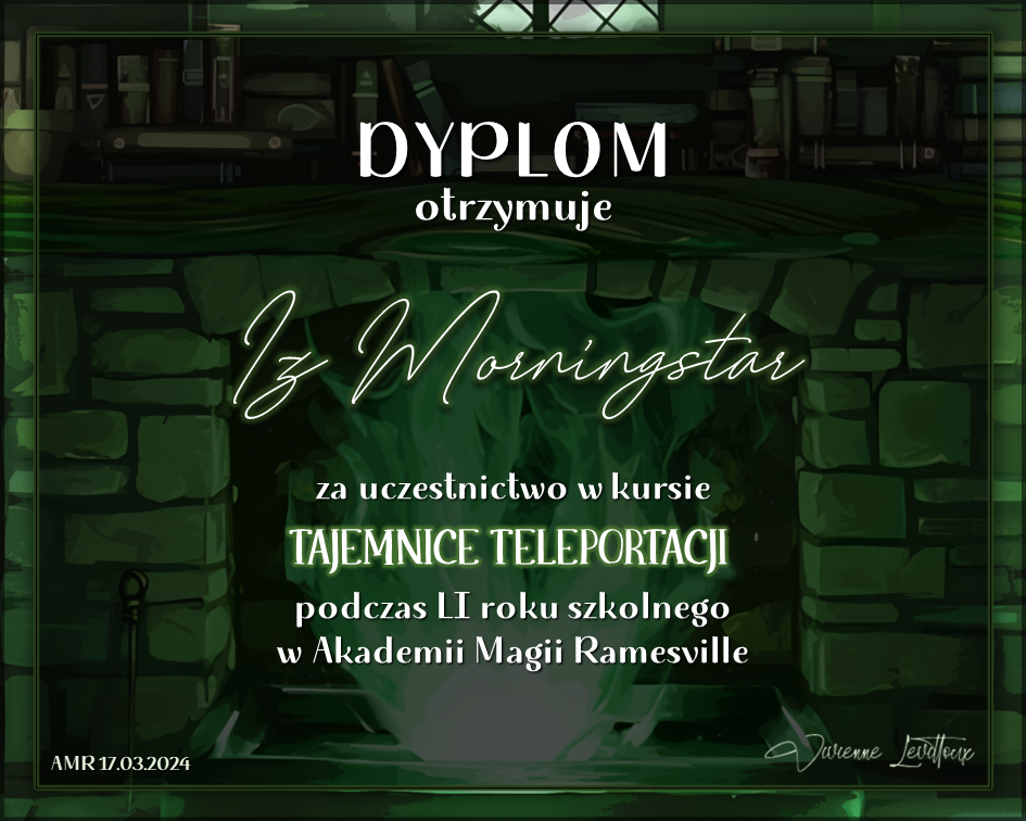 Wczoraj o godzinie 1900 odbyło się uroczyste zakończenie LI roku szkolnego. Dziękujemy za to, że tak wiele osób przyszło, aby pożegnać kolejny rok w Akademii Magii Ramesville. Poniżej znajduje się podsumowanie tego wydarzenia, zaś po kliknięciu w wybrane nazwisko wyświetli się dyplom. Oprócz tego w ciągu najbliższych kilku dni Izba Pamięci zostanie zaktualizowana.