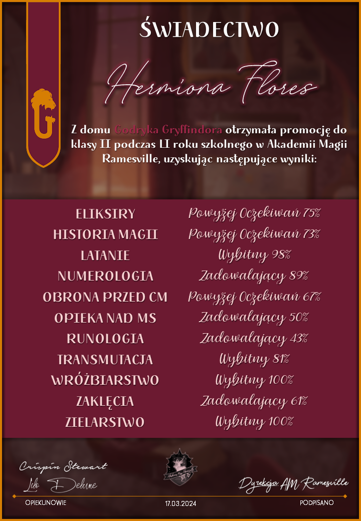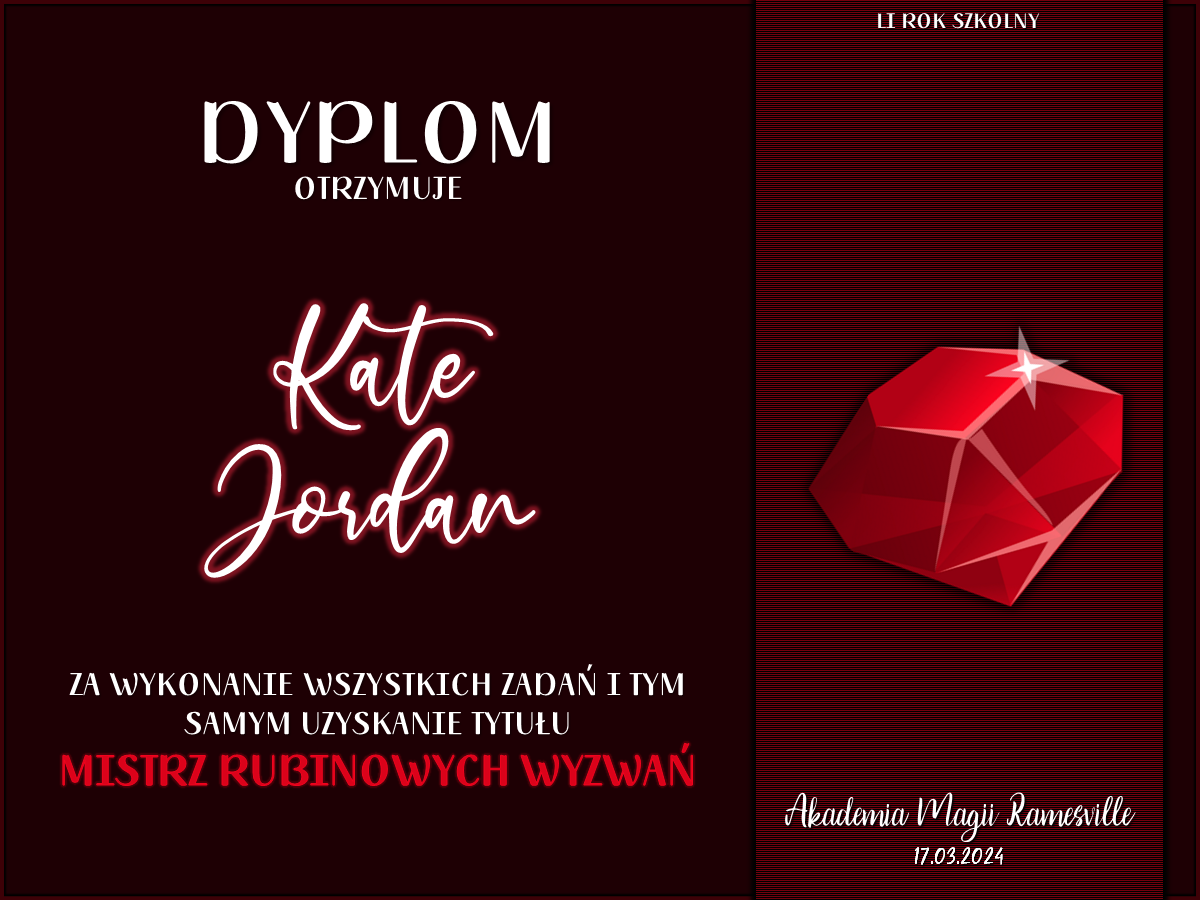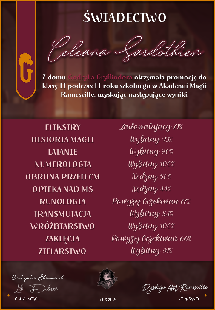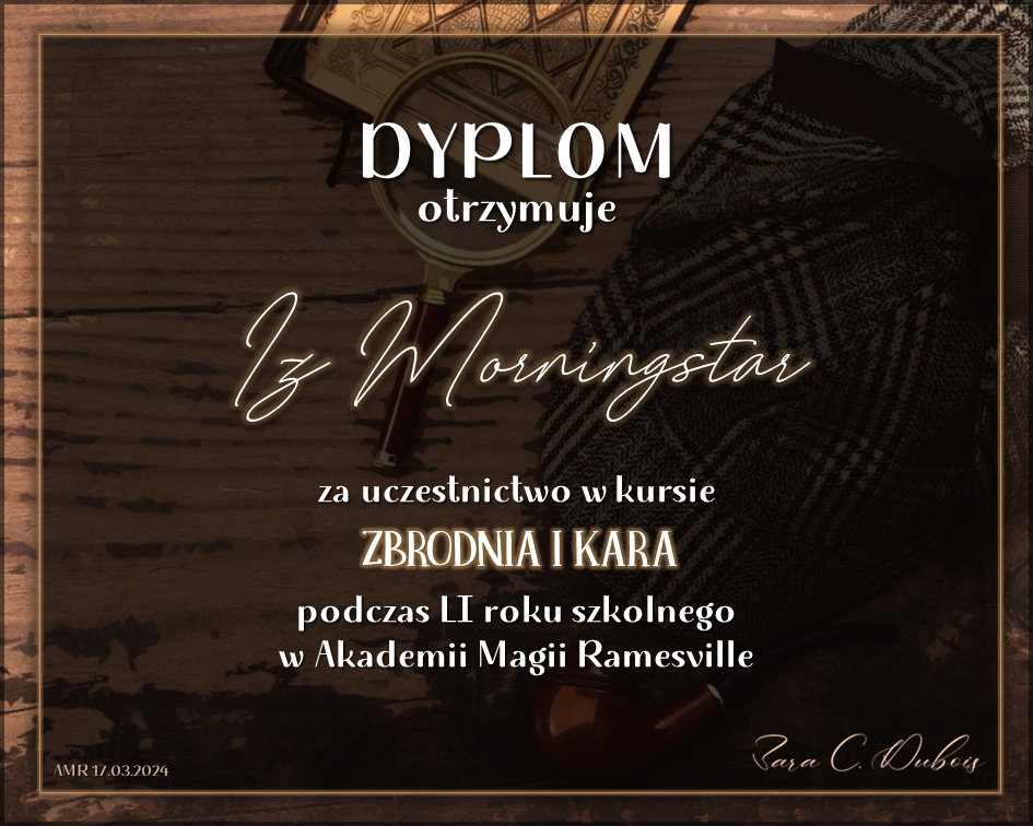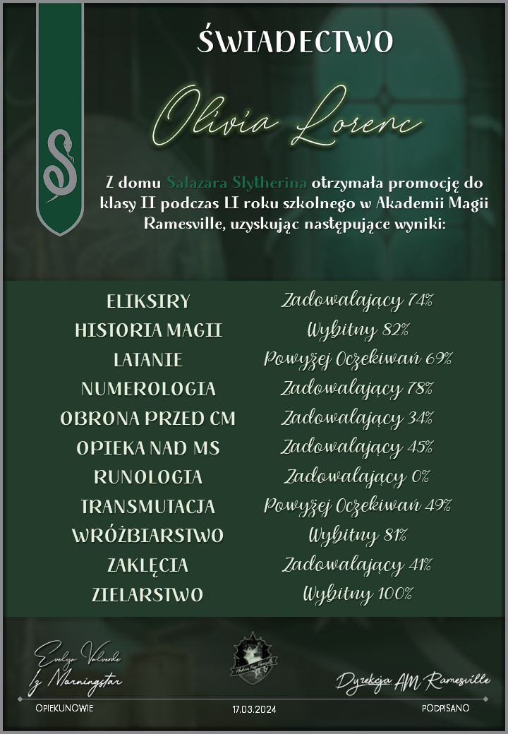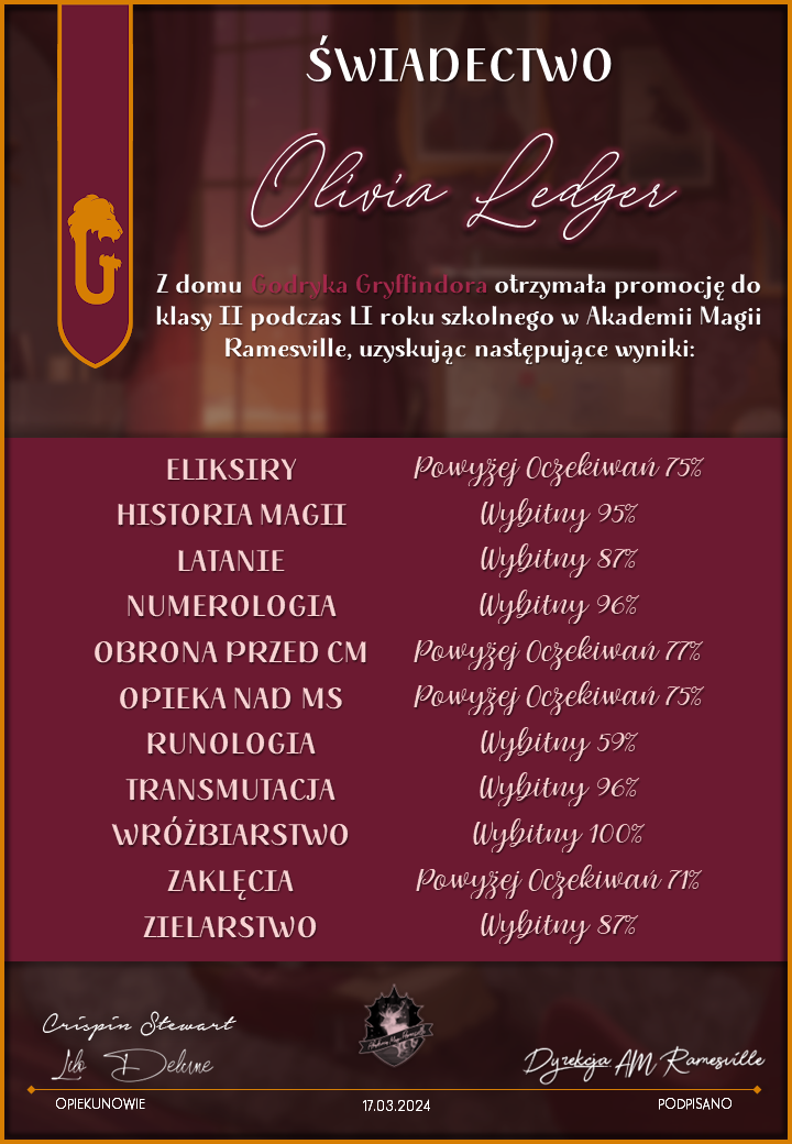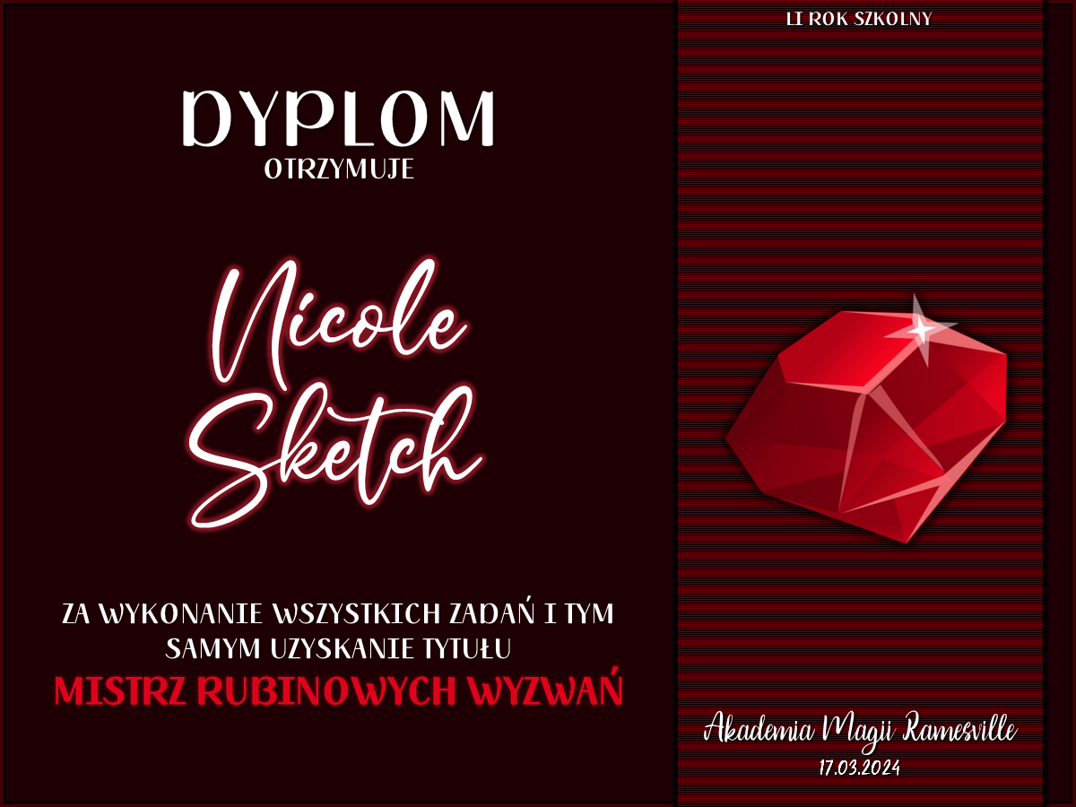 Wczoraj o godzinie 1900 odbyło się uroczyste zakończenie LI roku szkolnego. Dziękujemy za to, że tak wiele osób przyszło, aby pożegnać kolejny rok w Akademii Magii Ramesville. Poniżej znajduje się podsumowanie tego wydarzenia, zaś po kliknięciu w wybrane nazwisko wyświetli się dyplom. Oprócz tego w ciągu najbliższych kilku dni Izba Pamięci zostanie zaktualizowana.
