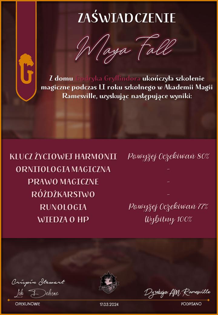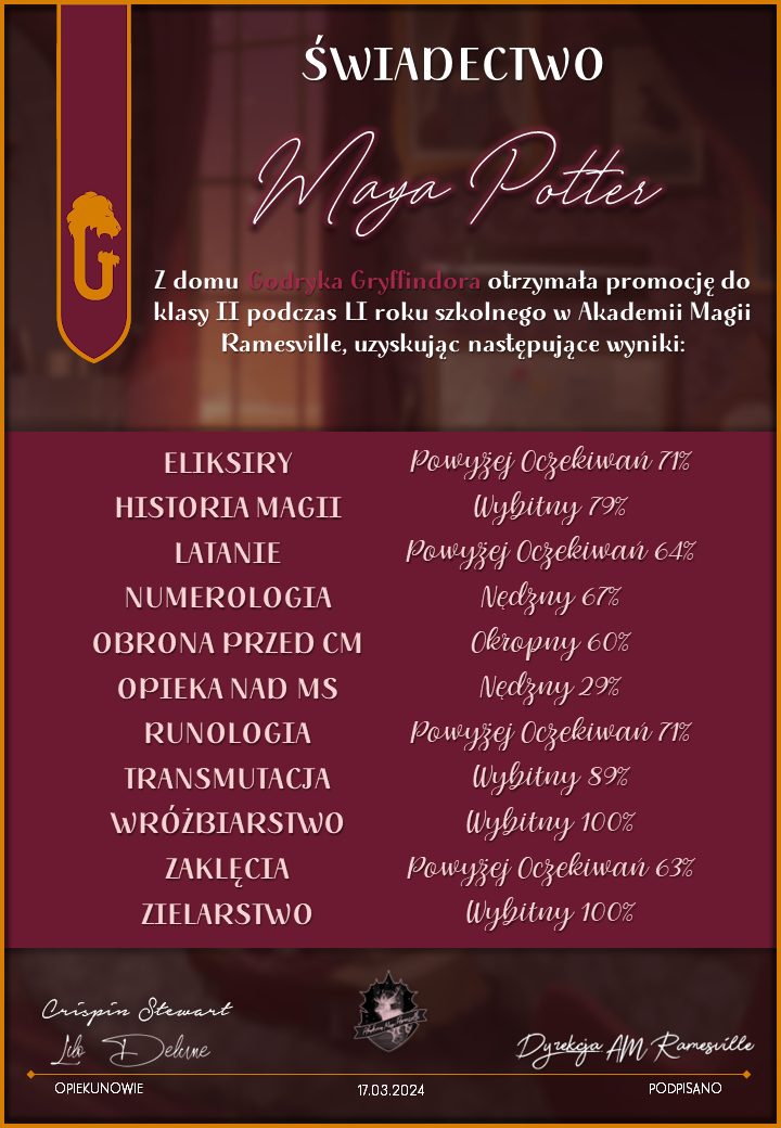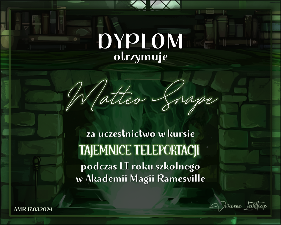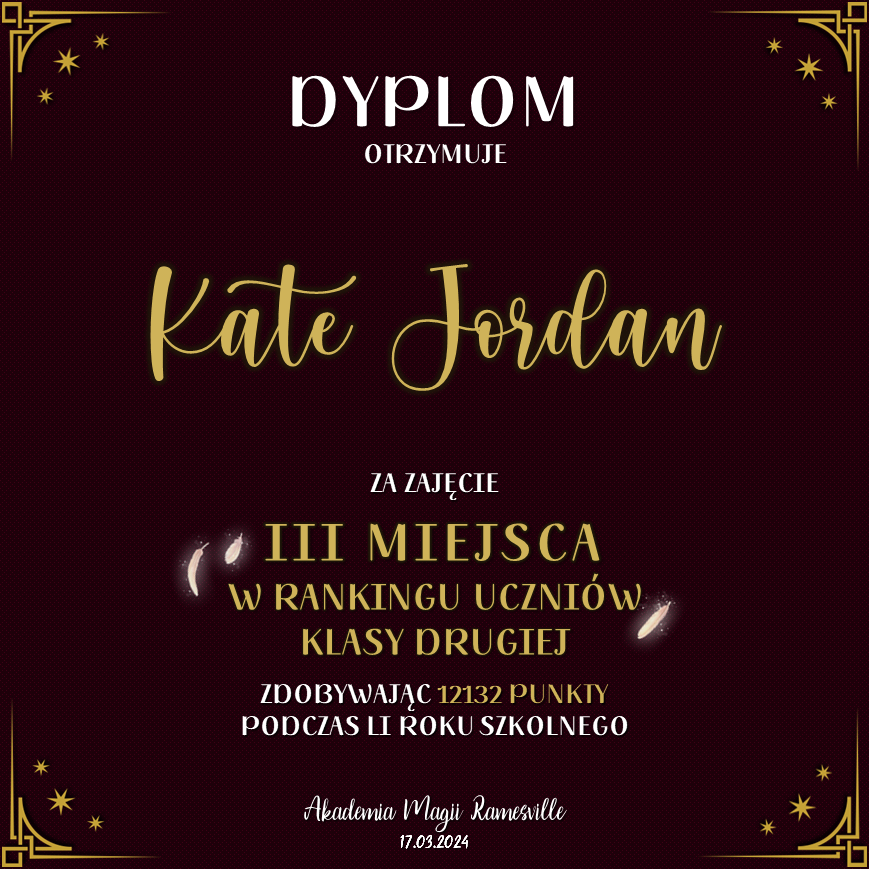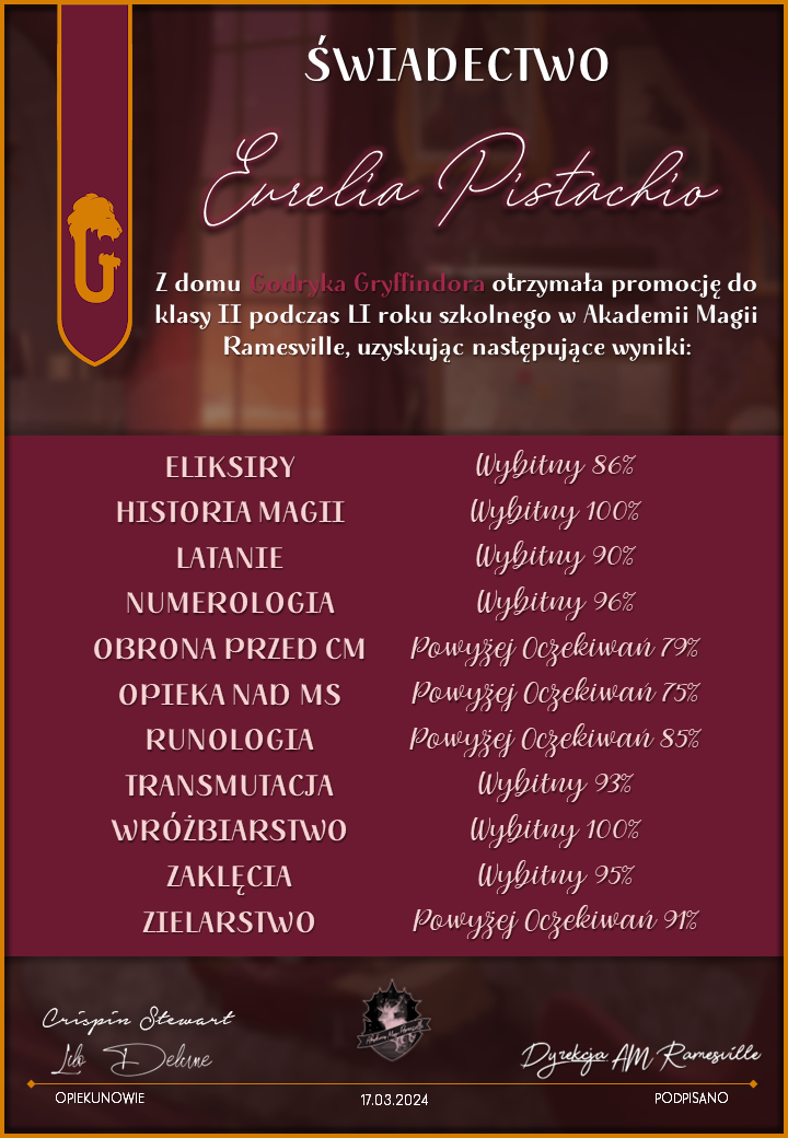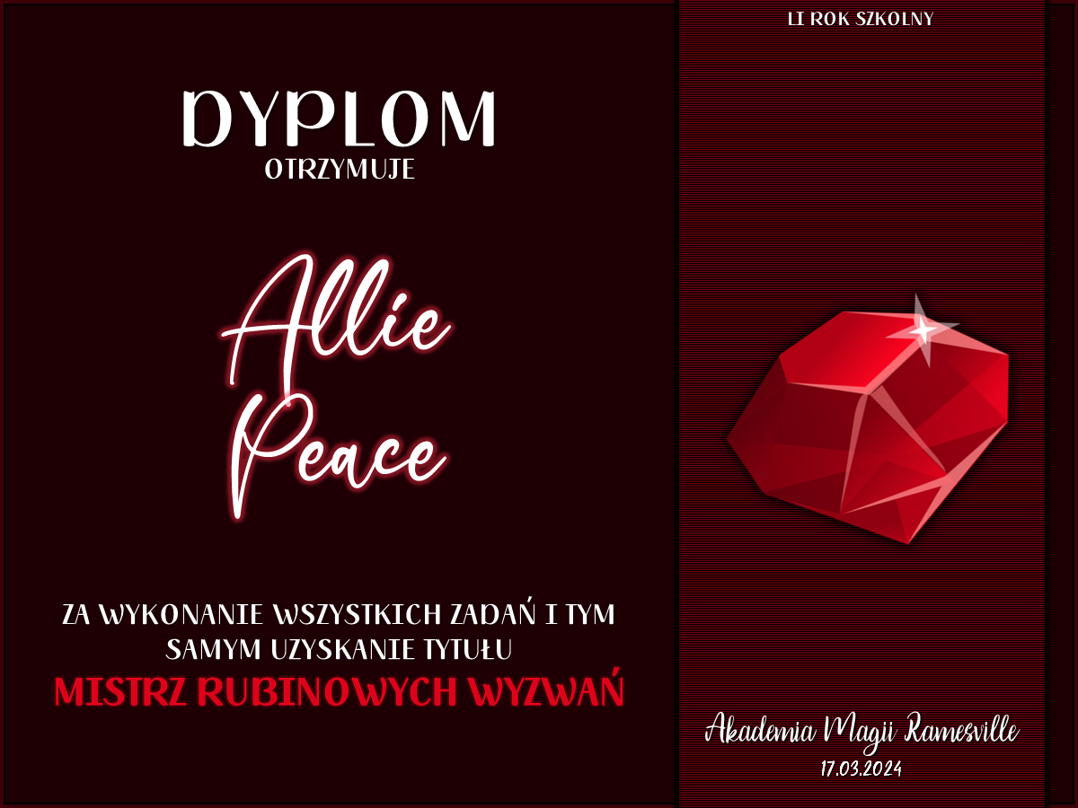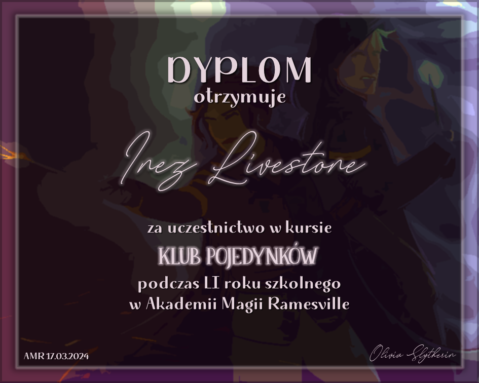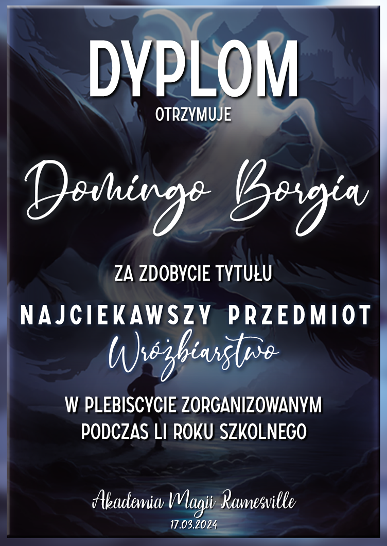 Wczoraj o godzinie 1900 odbyło się uroczyste zakończenie LI roku szkolnego. Dziękujemy za to, że tak wiele osób przyszło, aby pożegnać kolejny rok w Akademii Magii Ramesville. Poniżej znajduje się podsumowanie tego wydarzenia, zaś po kliknięciu w wybrane nazwisko wyświetli się dyplom. Oprócz tego w ciągu najbliższych kilku dni Izba Pamięci zostanie zaktualizowana.