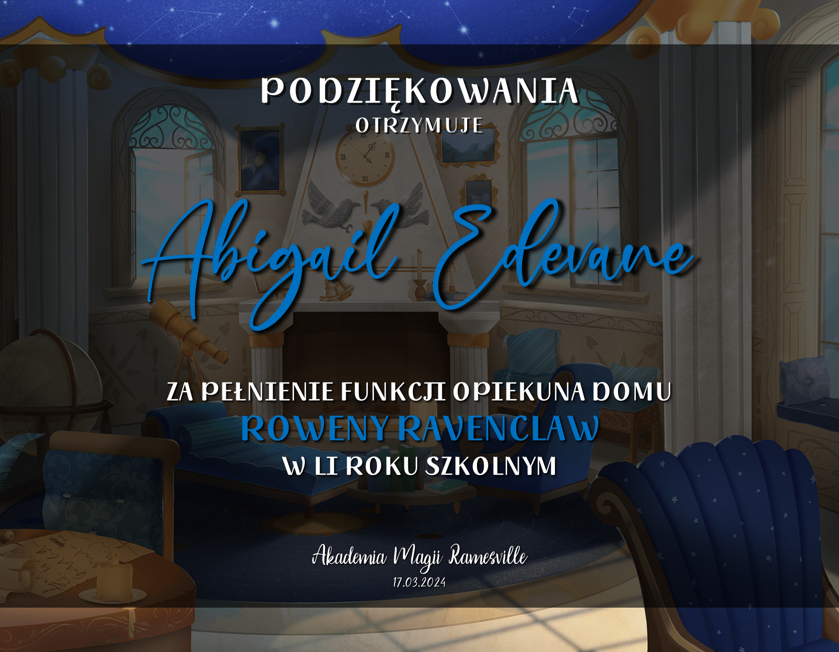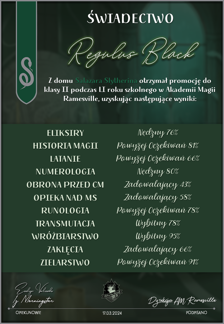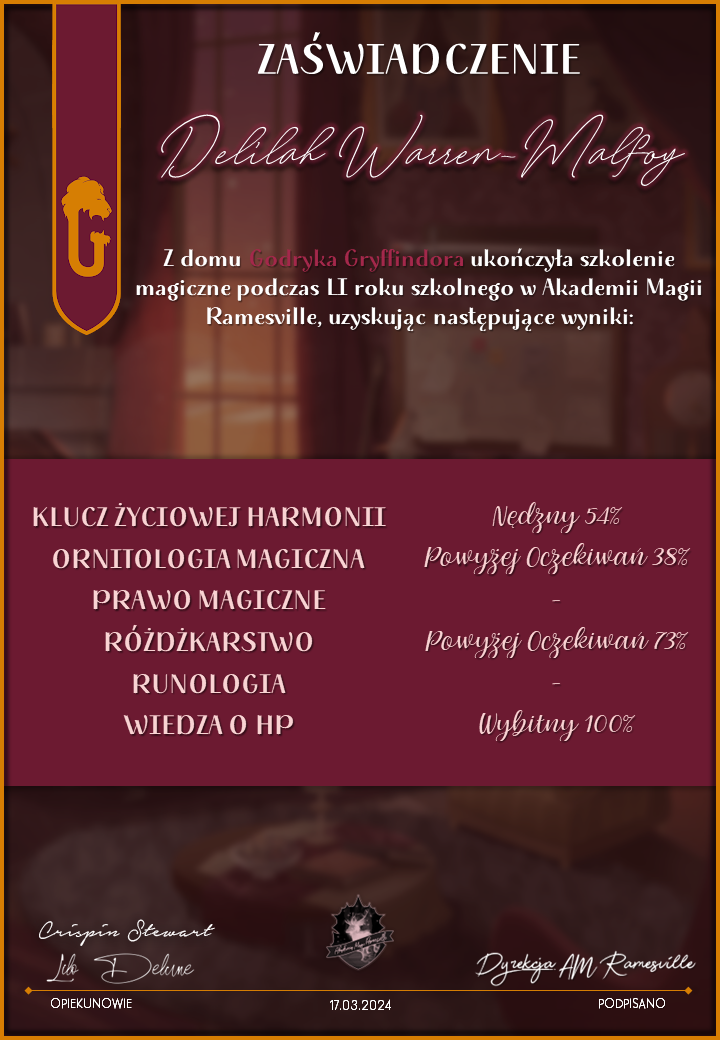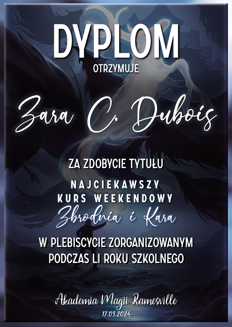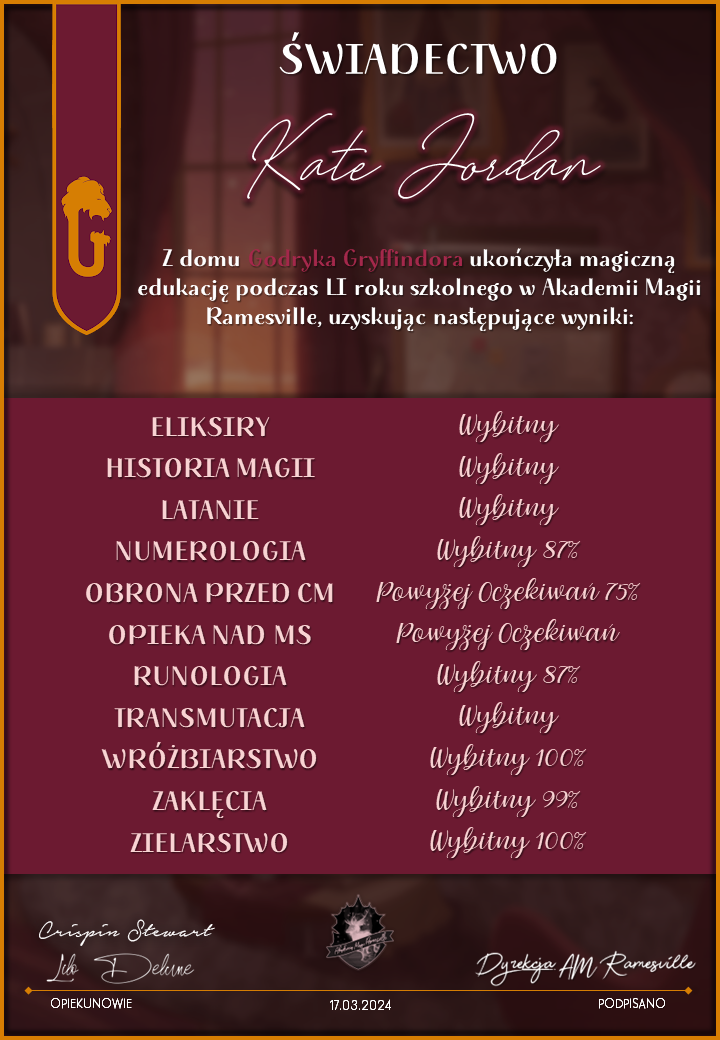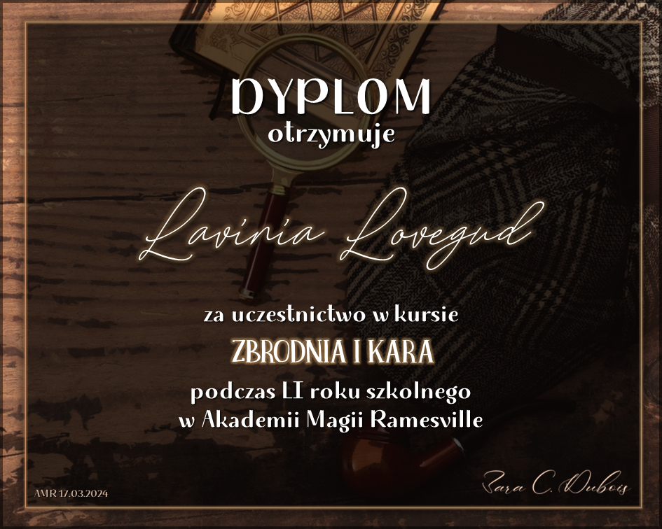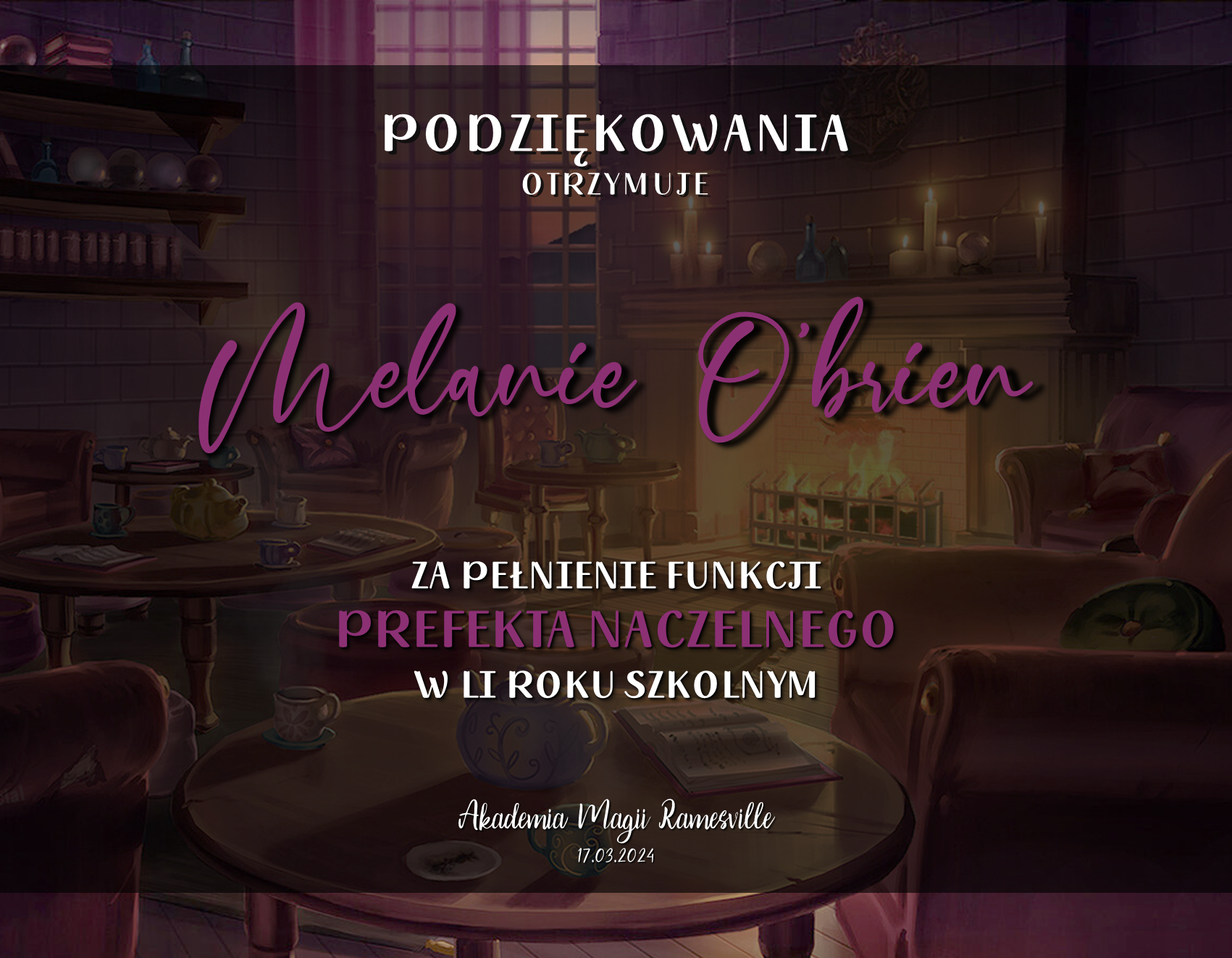 Wczoraj o godzinie 1900 odbyło się uroczyste zakończenie LI roku szkolnego. Dziękujemy za to, że tak wiele osób przyszło, aby pożegnać kolejny rok w Akademii Magii Ramesville. Poniżej znajduje się podsumowanie tego wydarzenia, zaś po kliknięciu w wybrane nazwisko wyświetli się dyplom. Oprócz tego w ciągu najbliższych kilku dni Izba Pamięci zostanie zaktualizowana.