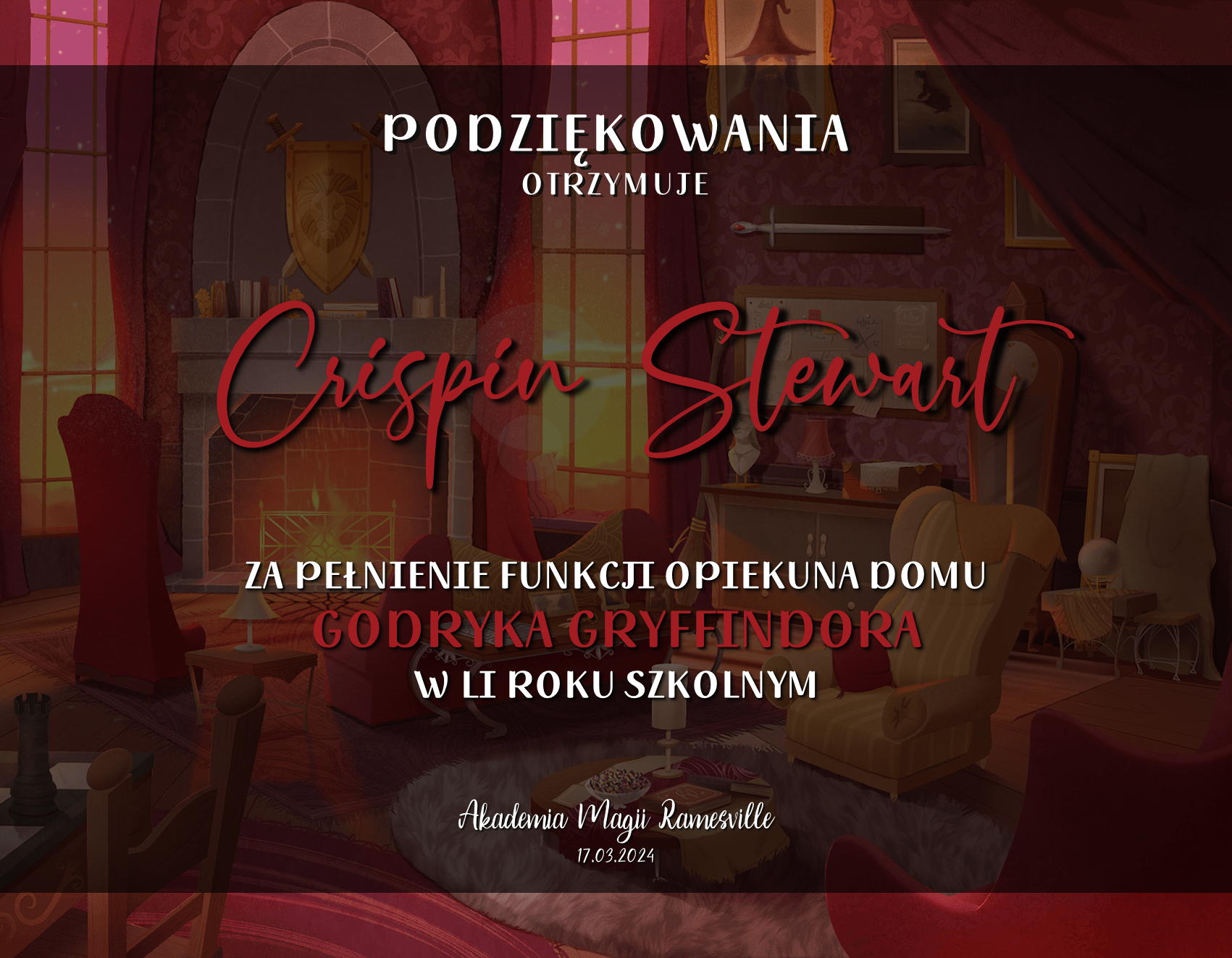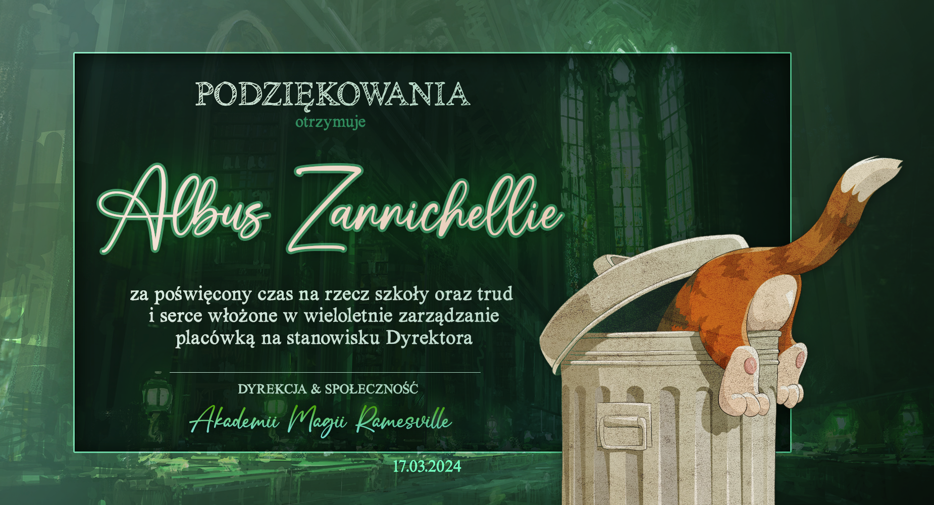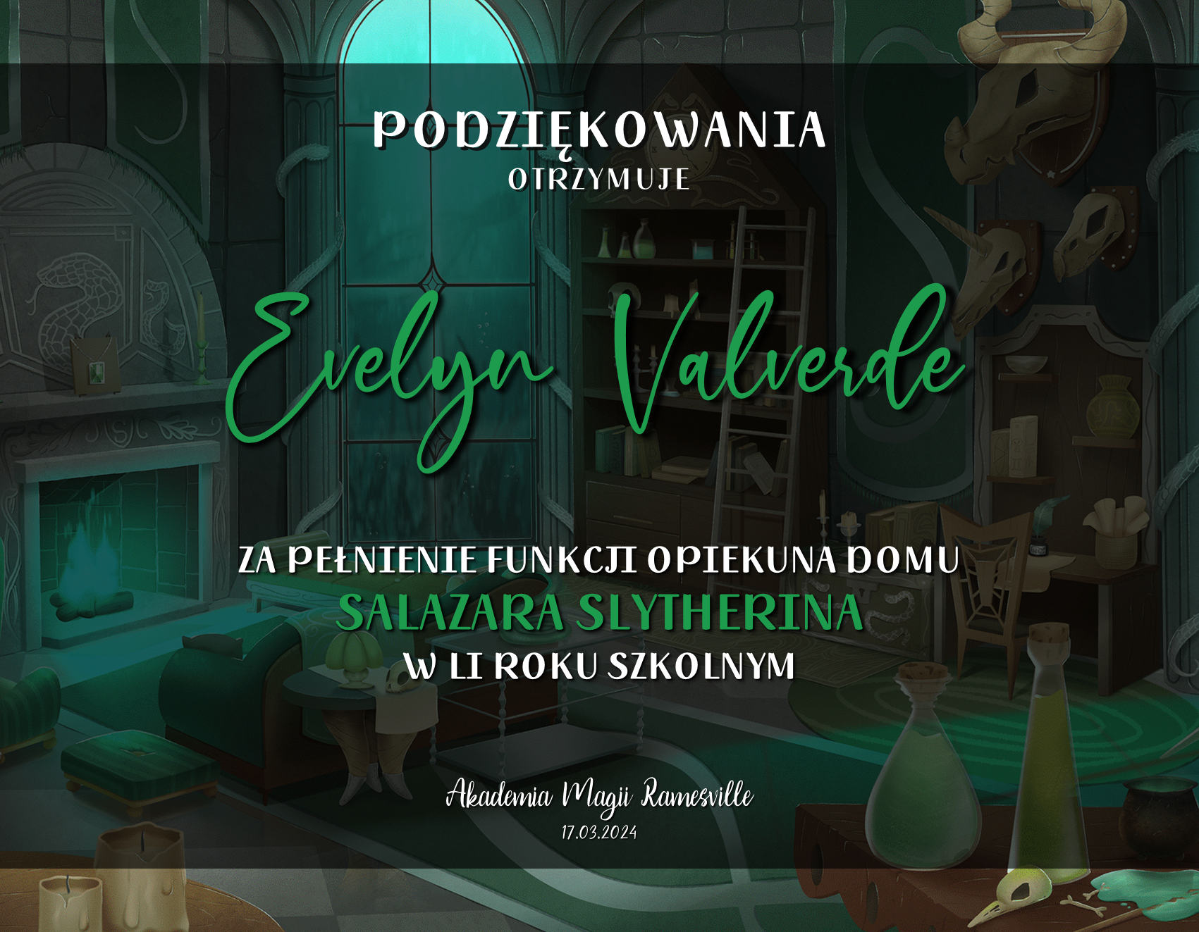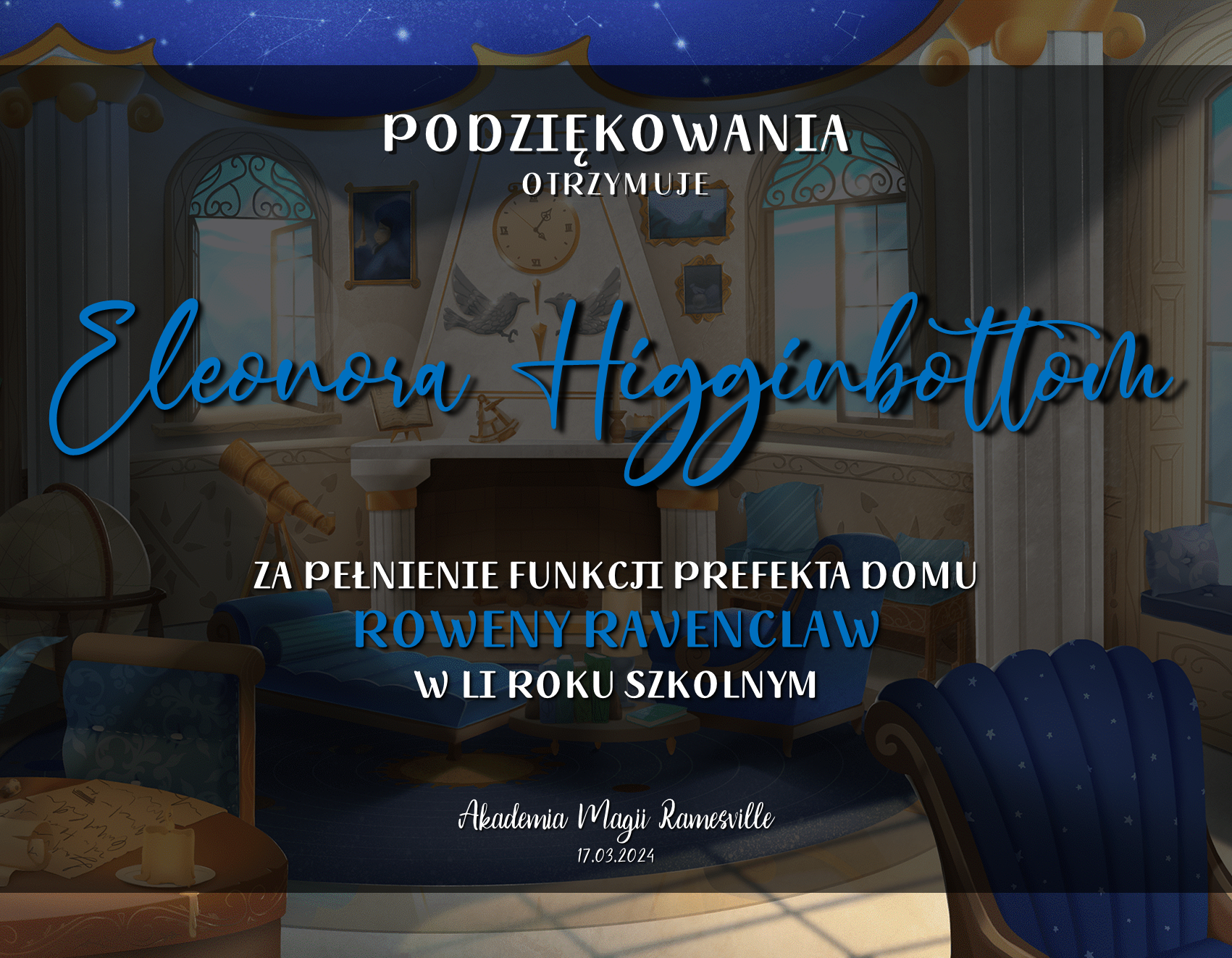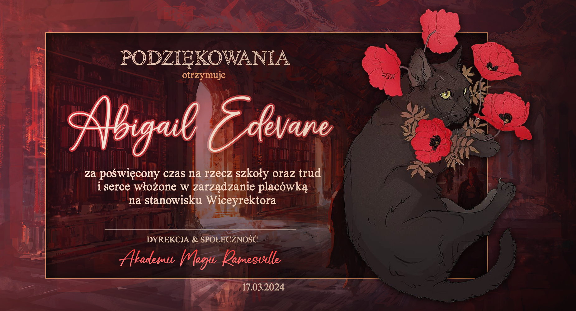 Wczoraj o godzinie 1900 odbyło się uroczyste zakończenie LI roku szkolnego. Dziękujemy za to, że tak wiele osób przyszło, aby pożegnać kolejny rok w Akademii Magii Ramesville. Poniżej znajduje się podsumowanie tego wydarzenia, zaś po kliknięciu w wybrane nazwisko wyświetli się dyplom. Oprócz tego w ciągu najbliższych kilku dni Izba Pamięci zostanie zaktualizowana.