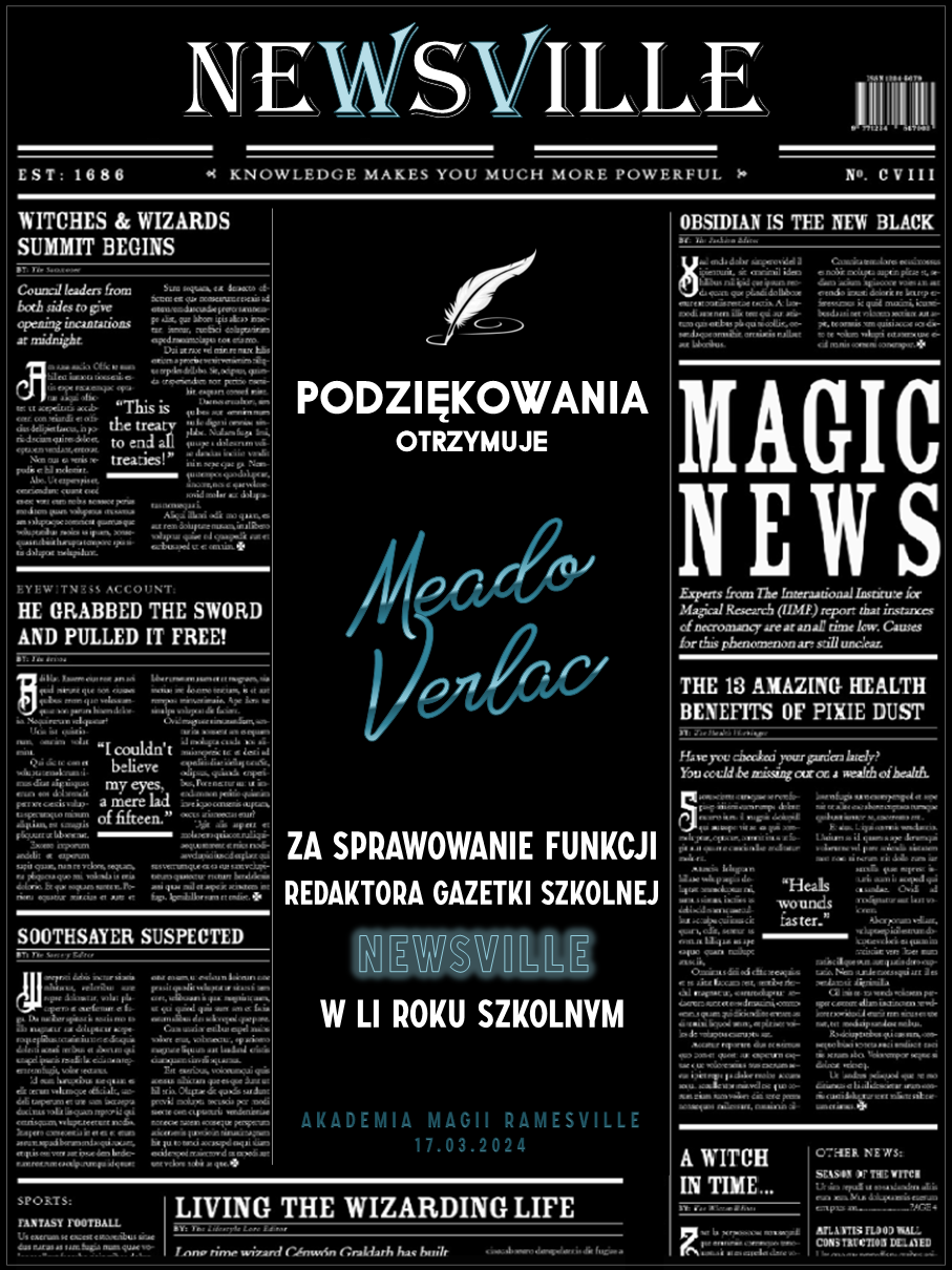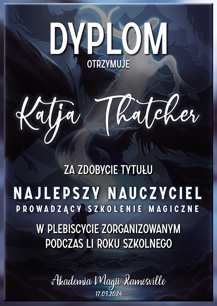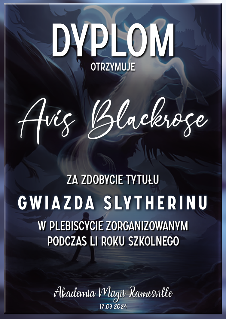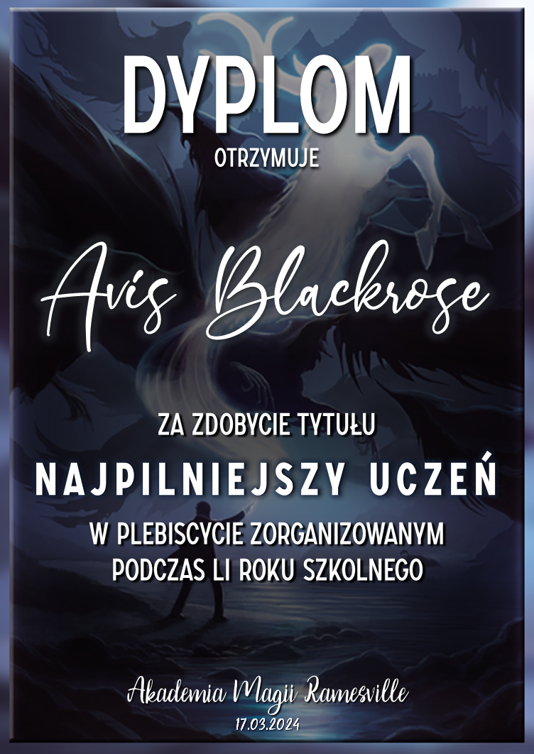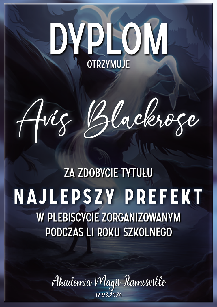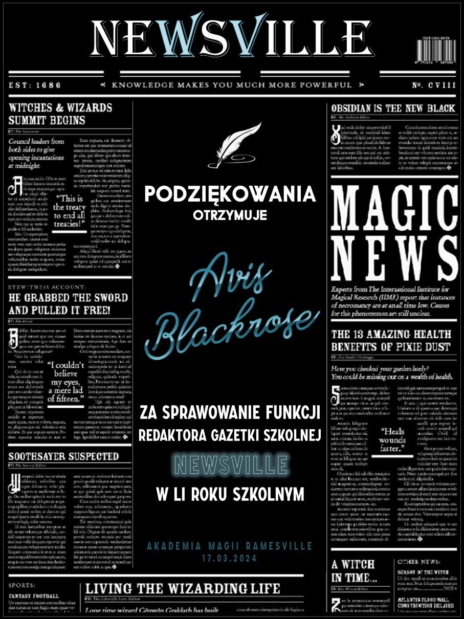 Przed rozpoczęciem tego roku szkolnego zwróciliśmy się do was z prośbą o promowanie naszej Akademii w różnych miejscach. Cieszymy się, że znalazły się osoby, które się w to zaangażowały! Niemniej chcielibyśmy wynagrodzić osobę, która była w to najbardziej zaangażowana i okrzyknąć ją mianem Łowcy Studentów. W LI roku szkolnym w Akademii Magii Ramesville tytuł ten zdobyła Avis Blackrose. Gratulujemy i zarazem dziękujemy! W niedługim czasie ktoś z dyrekcji skontaktuje się w celu ustalenia szczegółów dotyczących dostawy nagrody rzeczowej.