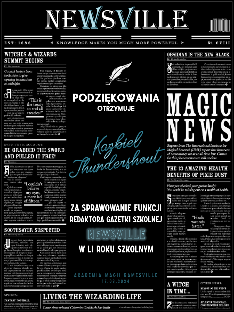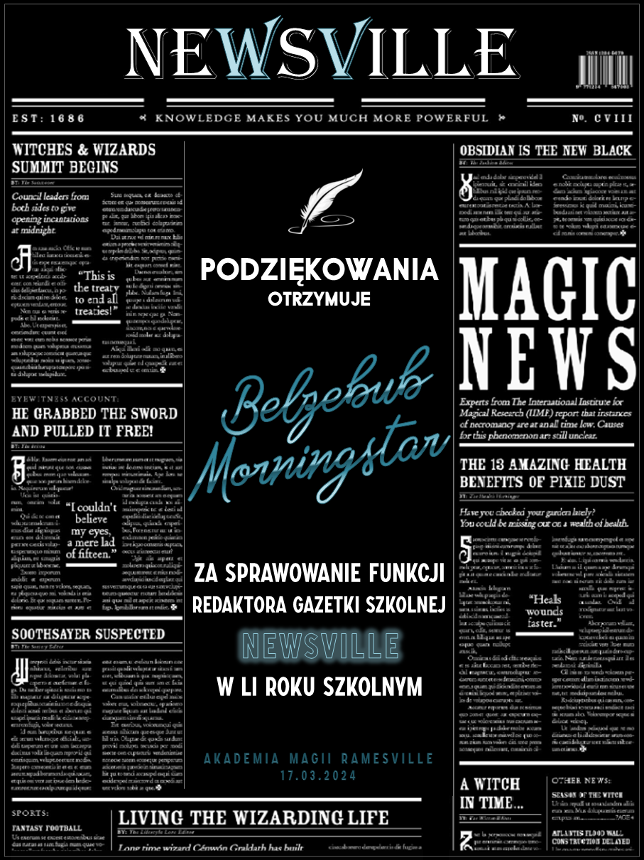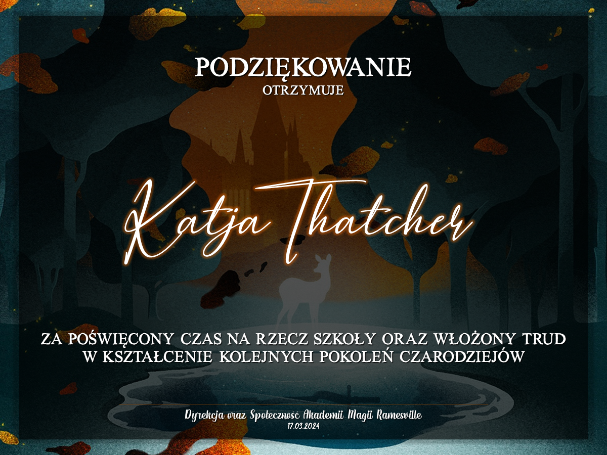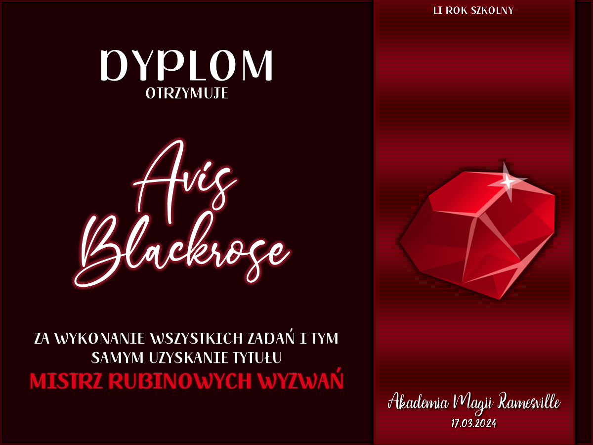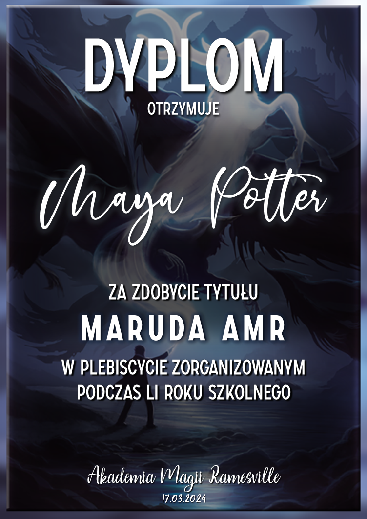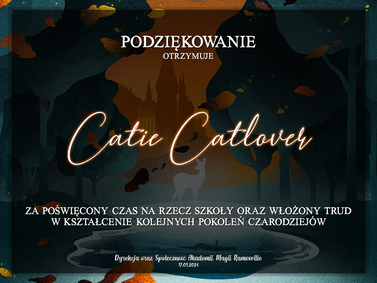 Przed rozpoczęciem tego roku szkolnego zwróciliśmy się do was z prośbą o promowanie naszej Akademii w różnych miejscach. Cieszymy się, że znalazły się osoby, które się w to zaangażowały! Niemniej chcielibyśmy wynagrodzić osobę, która była w to najbardziej zaangażowana i okrzyknąć ją mianem Łowcy Studentów. W LI roku szkolnym w Akademii Magii Ramesville tytuł ten zdobyła Avis Blackrose. Gratulujemy i zarazem dziękujemy! W niedługim czasie ktoś z dyrekcji skontaktuje się w celu ustalenia szczegółów dotyczących dostawy nagrody rzeczowej.