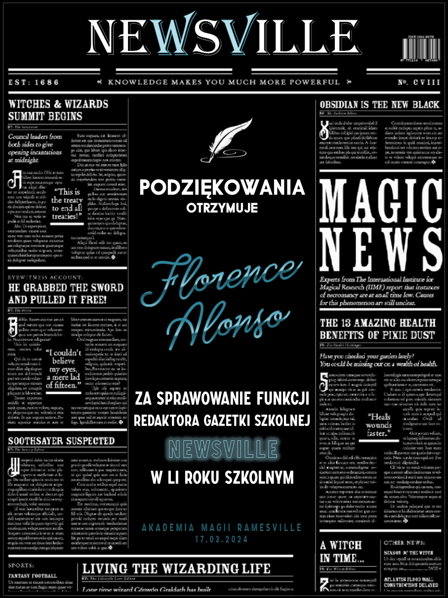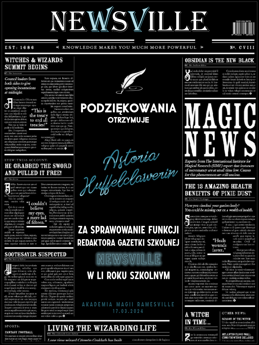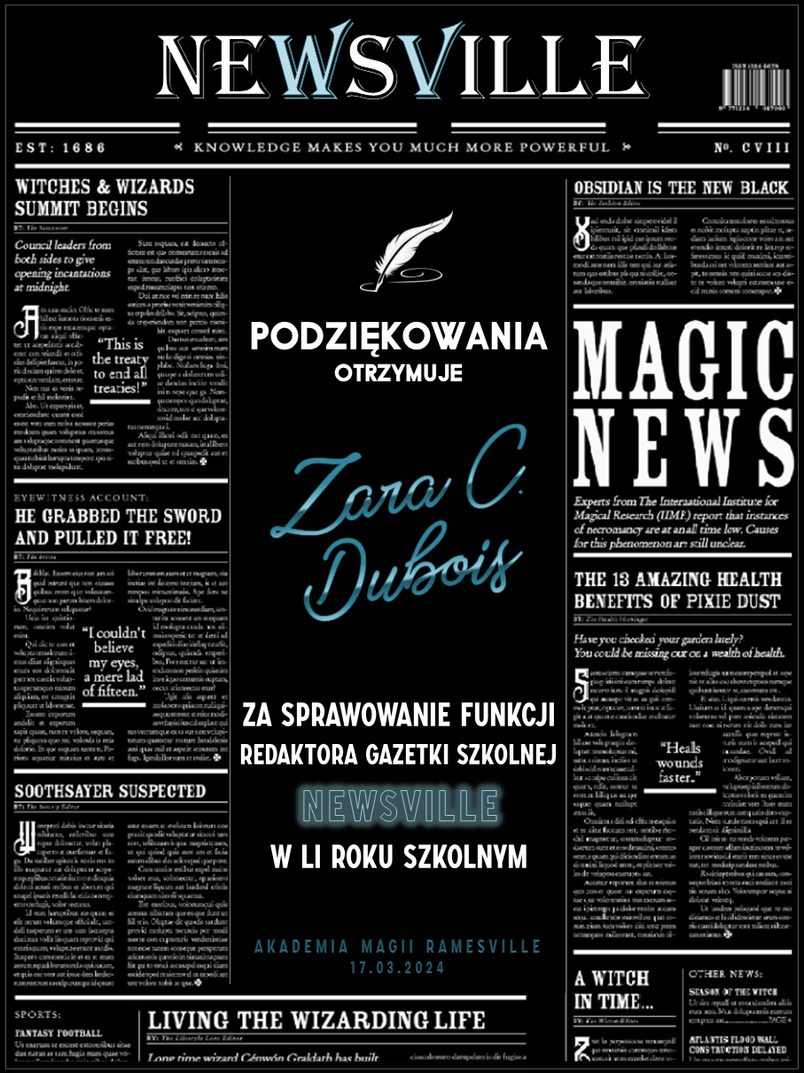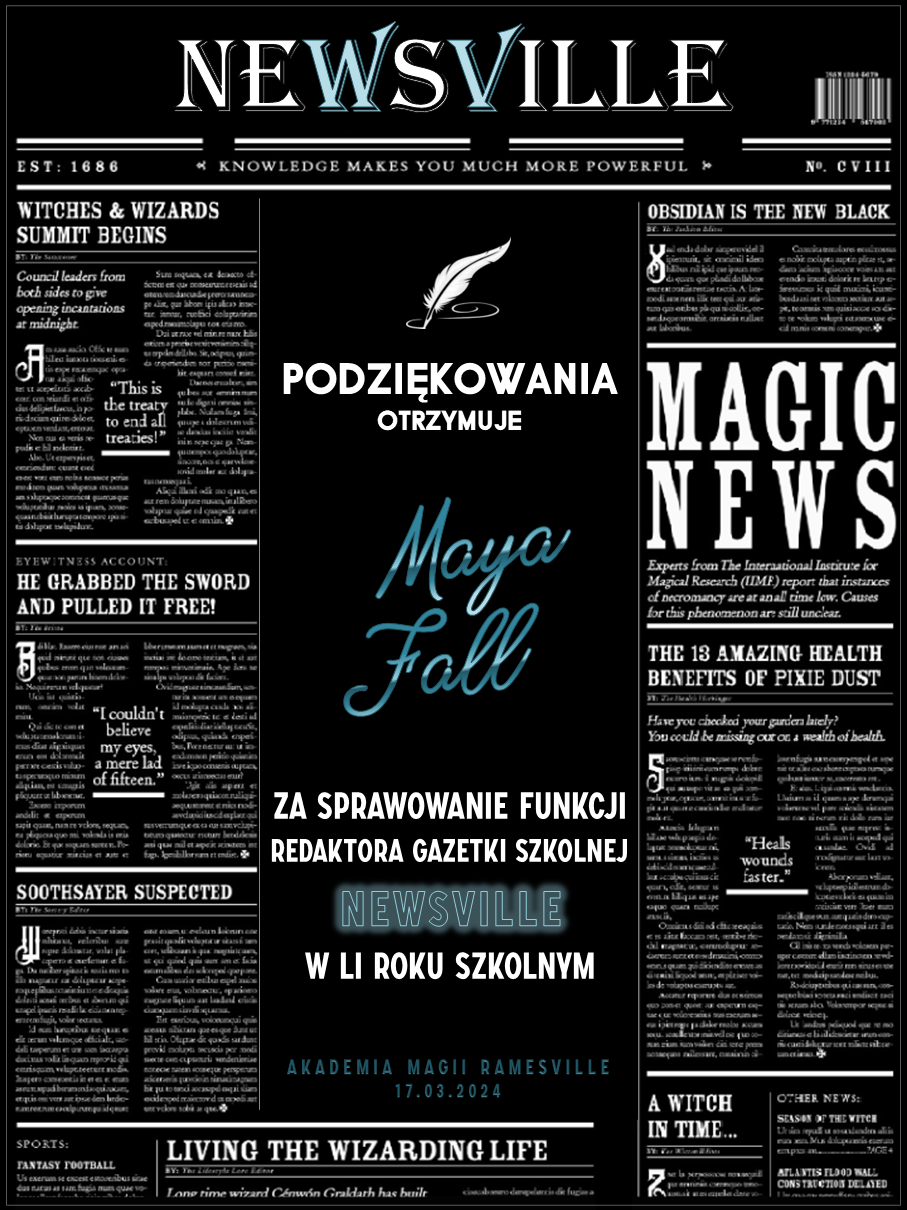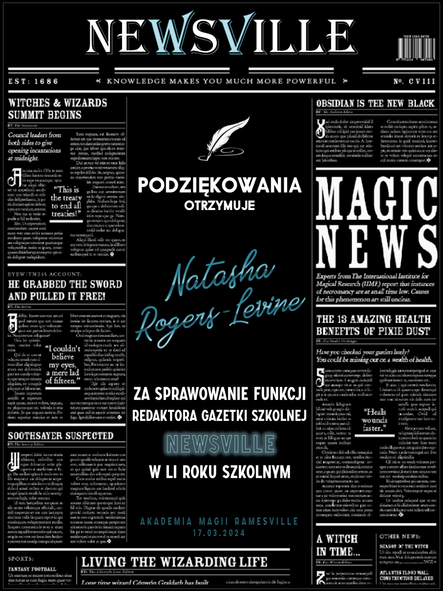Przed rozpoczęciem tego roku szkolnego zwróciliśmy się do was z prośbą o promowanie naszej Akademii w różnych miejscach. Cieszymy się, że znalazły się osoby, które się w to zaangażowały! Niemniej chcielibyśmy wynagrodzić osobę, która była w to najbardziej zaangażowana i okrzyknąć ją mianem Łowcy Studentów. W LI roku szkolnym w Akademii Magii Ramesville tytuł ten zdobyła Avis Blackrose. Gratulujemy i zarazem dziękujemy! W niedługim czasie ktoś z dyrekcji skontaktuje się w celu ustalenia szczegółów dotyczących dostawy nagrody rzeczowej.