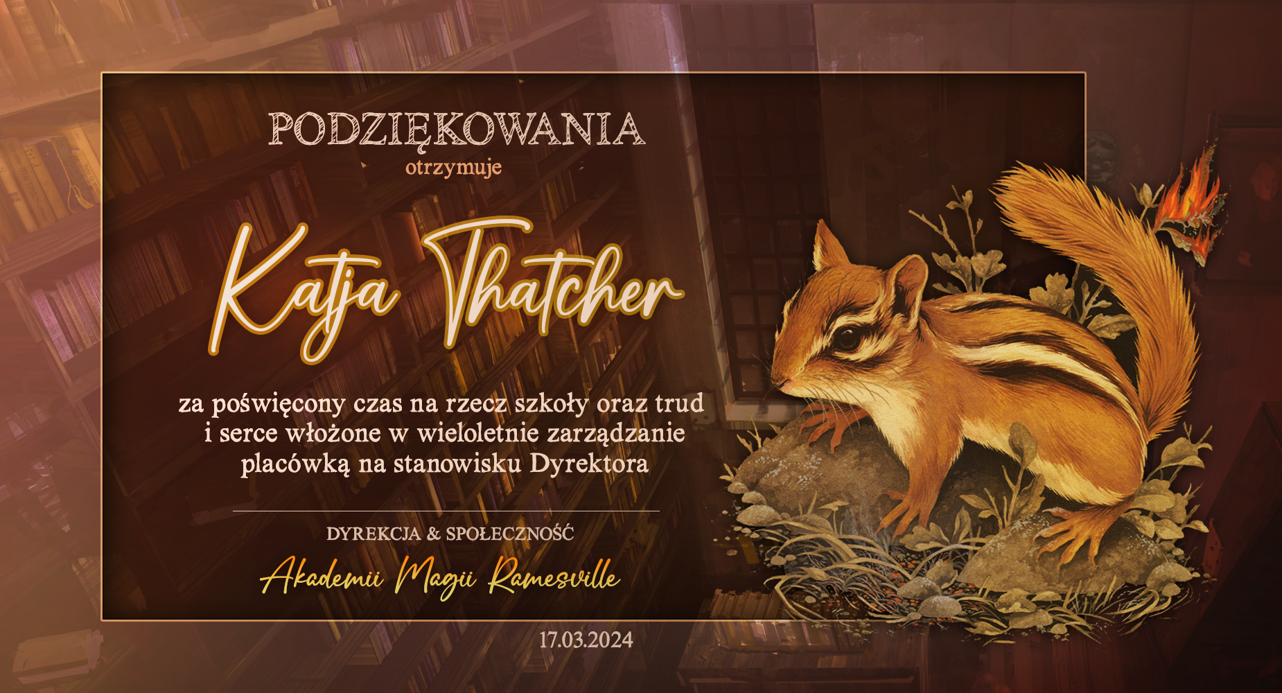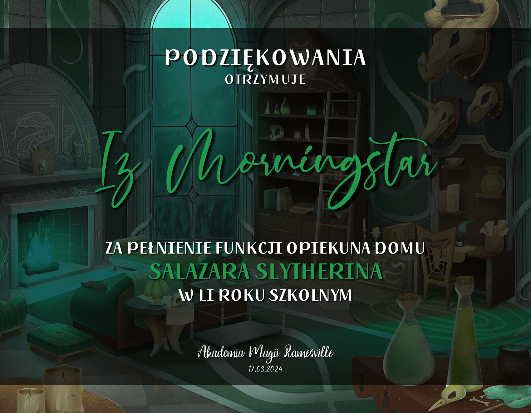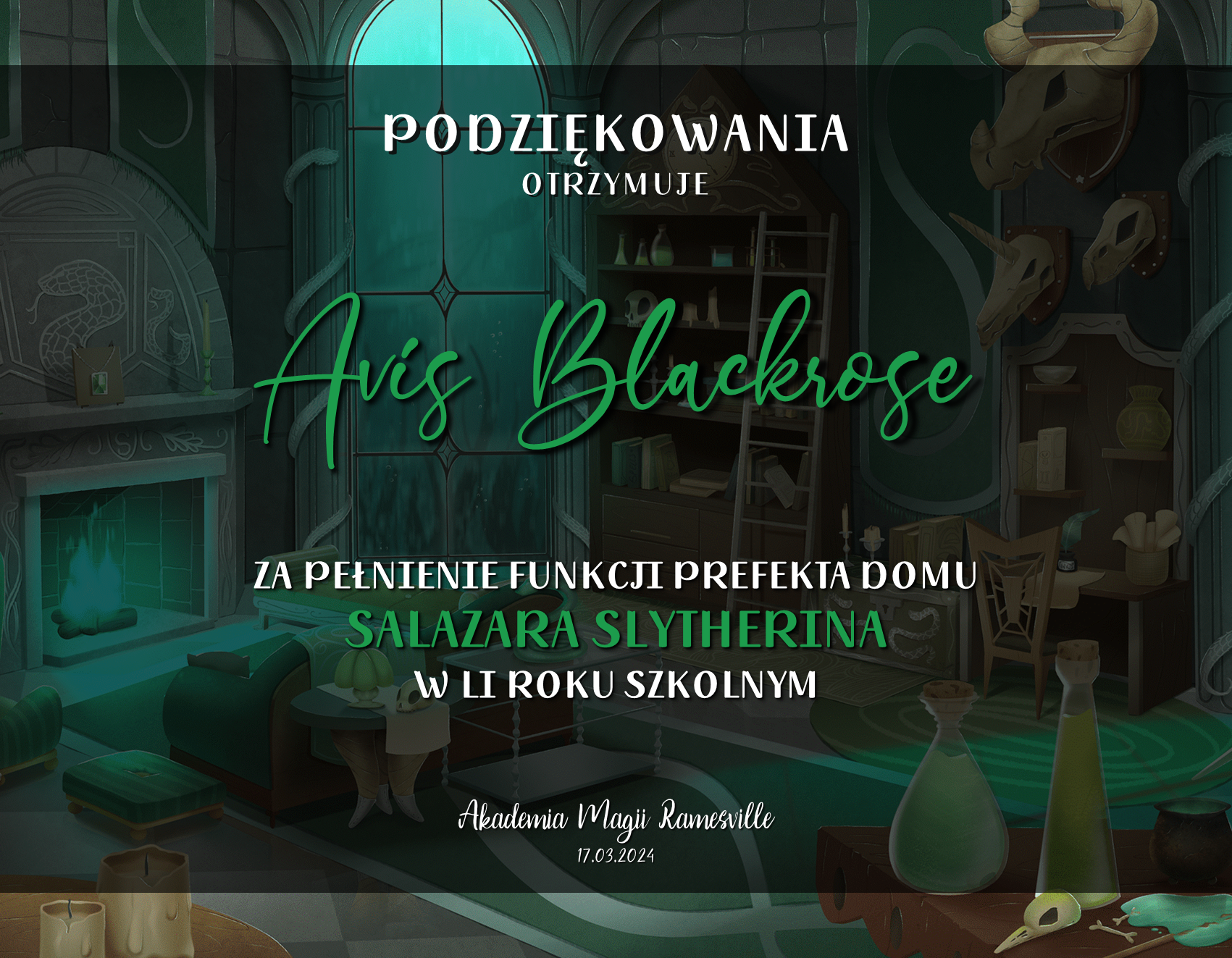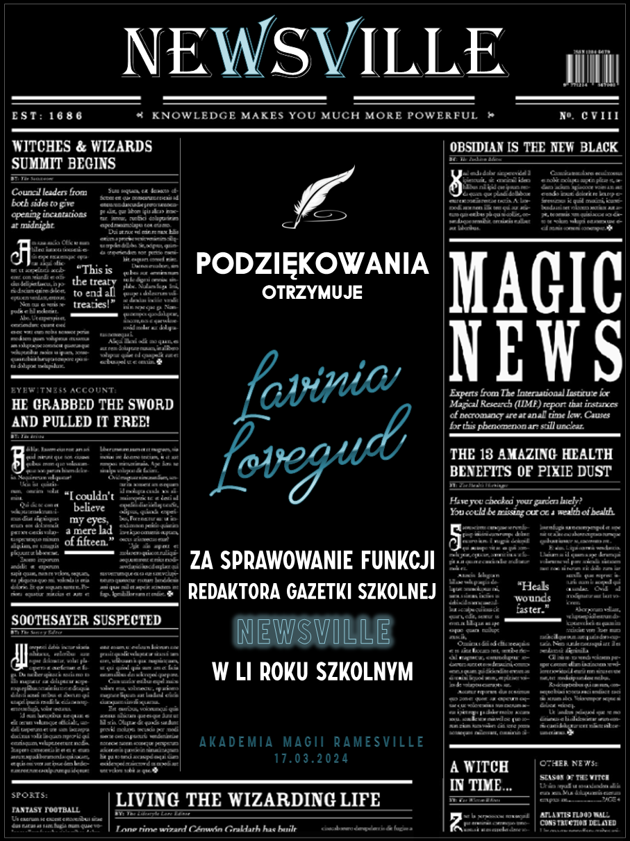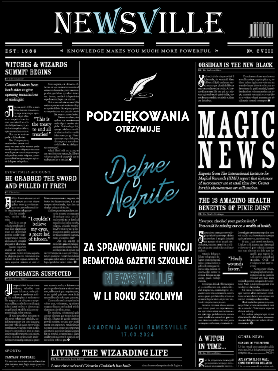 Przed rozpoczęciem tego roku szkolnego zwróciliśmy się do was z prośbą o promowanie naszej Akademii w różnych miejscach. Cieszymy się, że znalazły się osoby, które się w to zaangażowały! Niemniej chcielibyśmy wynagrodzić osobę, która była w to najbardziej zaangażowana i okrzyknąć ją mianem Łowcy Studentów. W LI roku szkolnym w Akademii Magii Ramesville tytuł ten zdobyła Avis Blackrose. Gratulujemy i zarazem dziękujemy! W niedługim czasie ktoś z dyrekcji skontaktuje się w celu ustalenia szczegółów dotyczących dostawy nagrody rzeczowej.