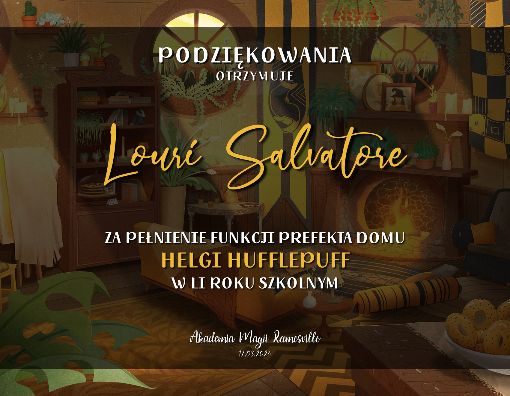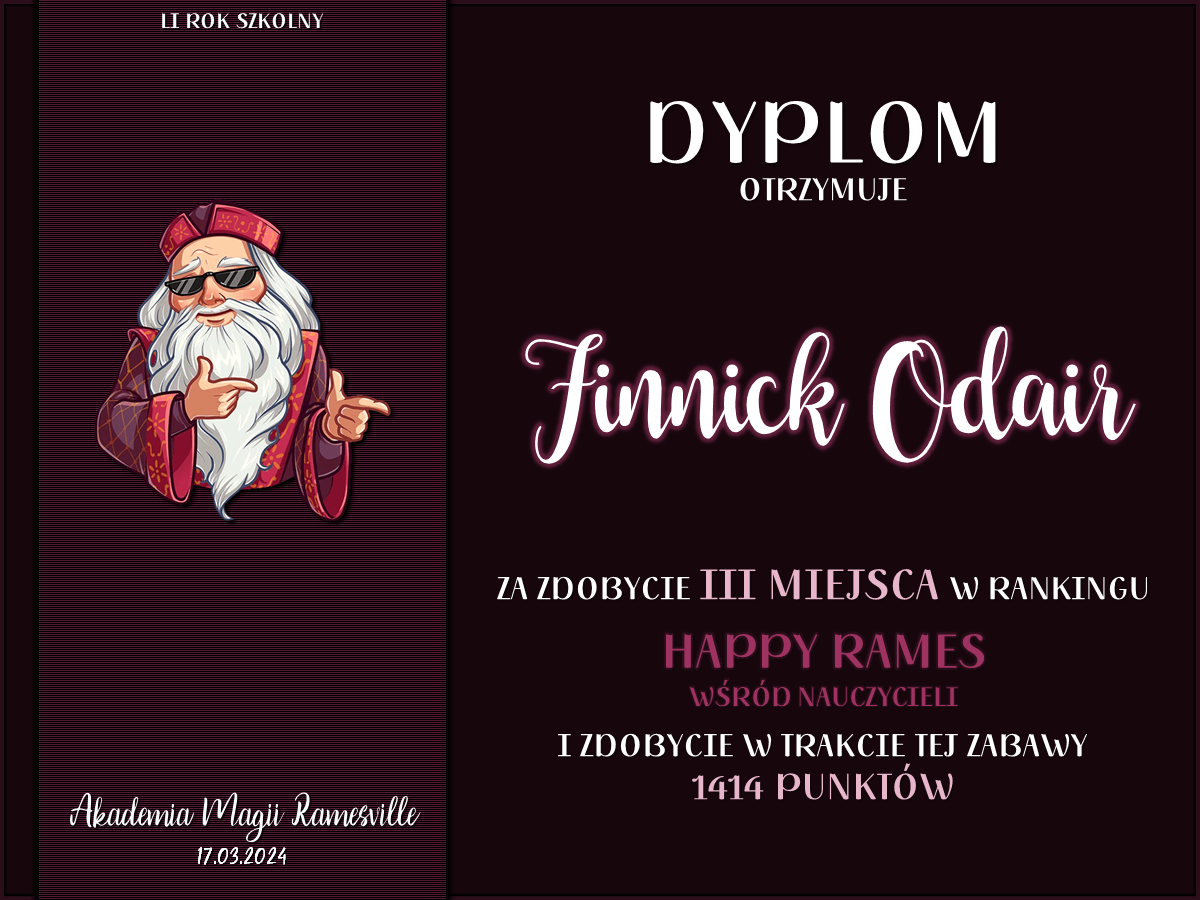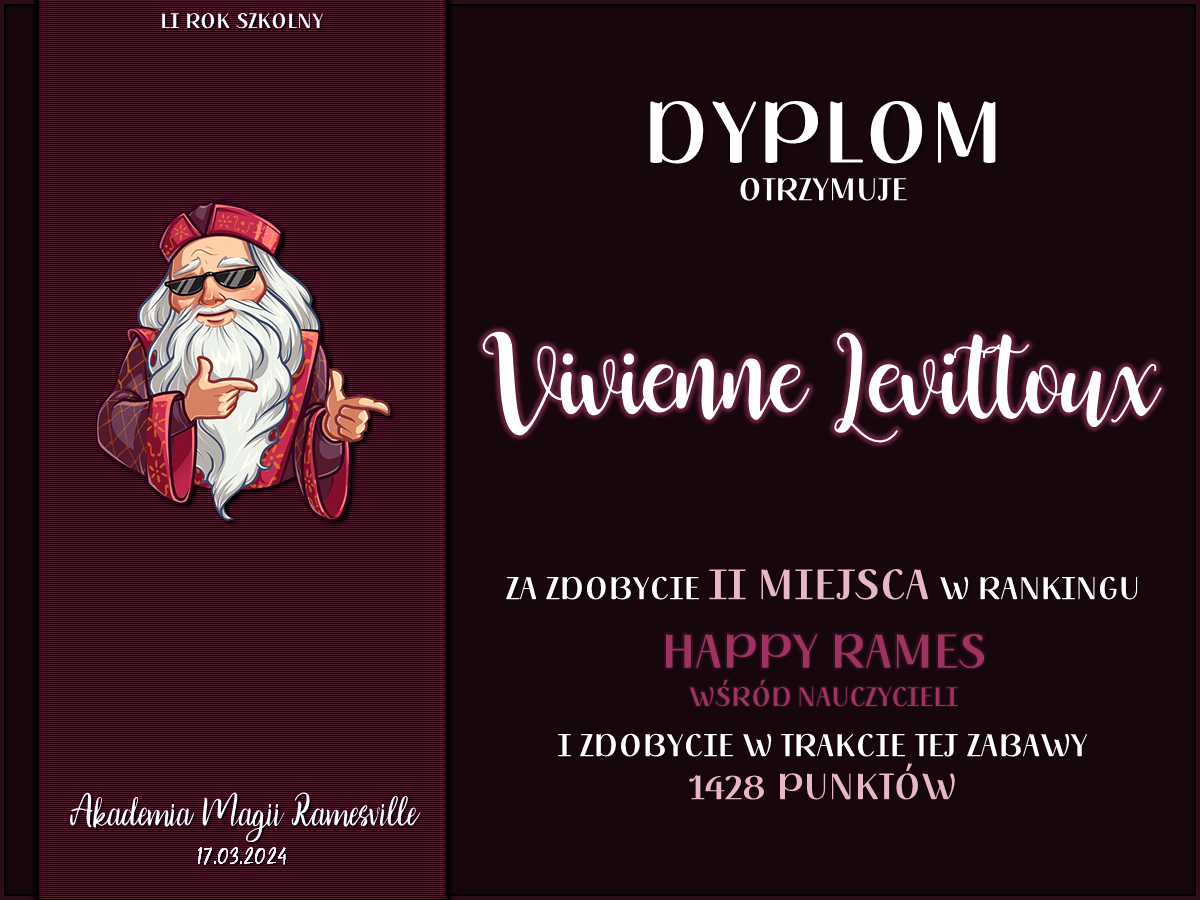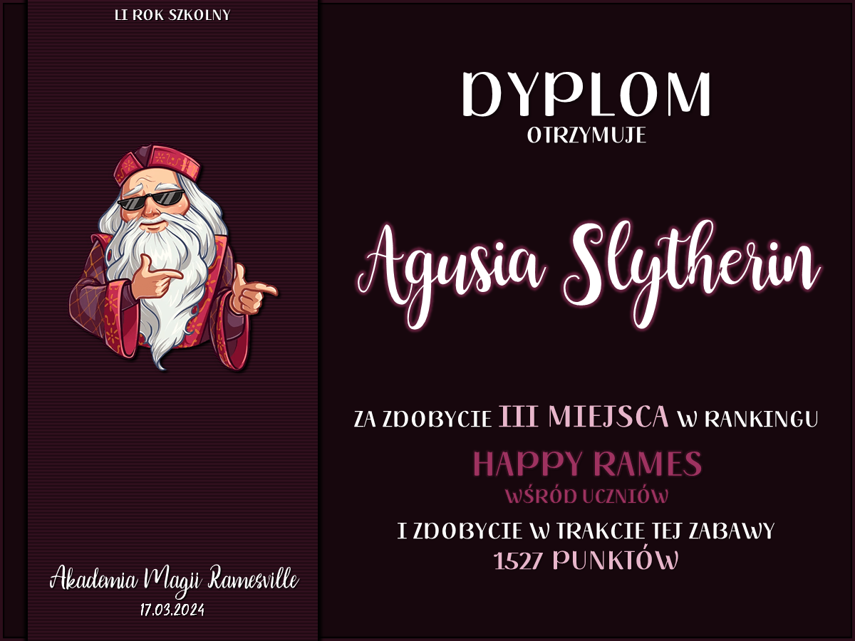Przez cały semestr odbywały się krótkie zabawy o tematyce potterowskiej lub ramesvillowskiej, w których mógł wziąć udział każdy członek naszej społeczności. Spośród zaangażowanych osób wyróżniliśmy dziewięć które zdobyły najwięcej punktów w każdej z grup — uczniowskiej, stażowej i nauczycielskiej, a następnie przyznaliśmy im tytuły Mistrza Happy Rames. Nagrodzone osoby to: