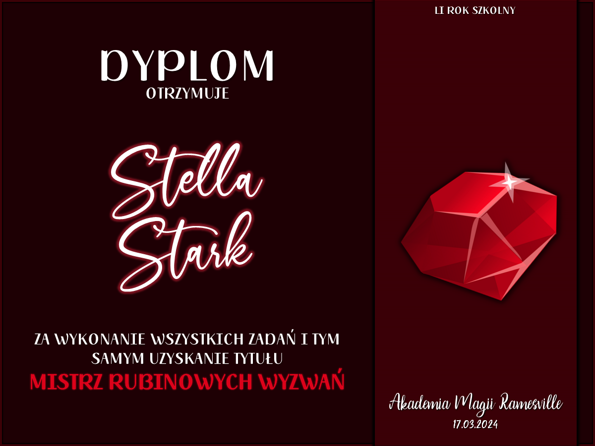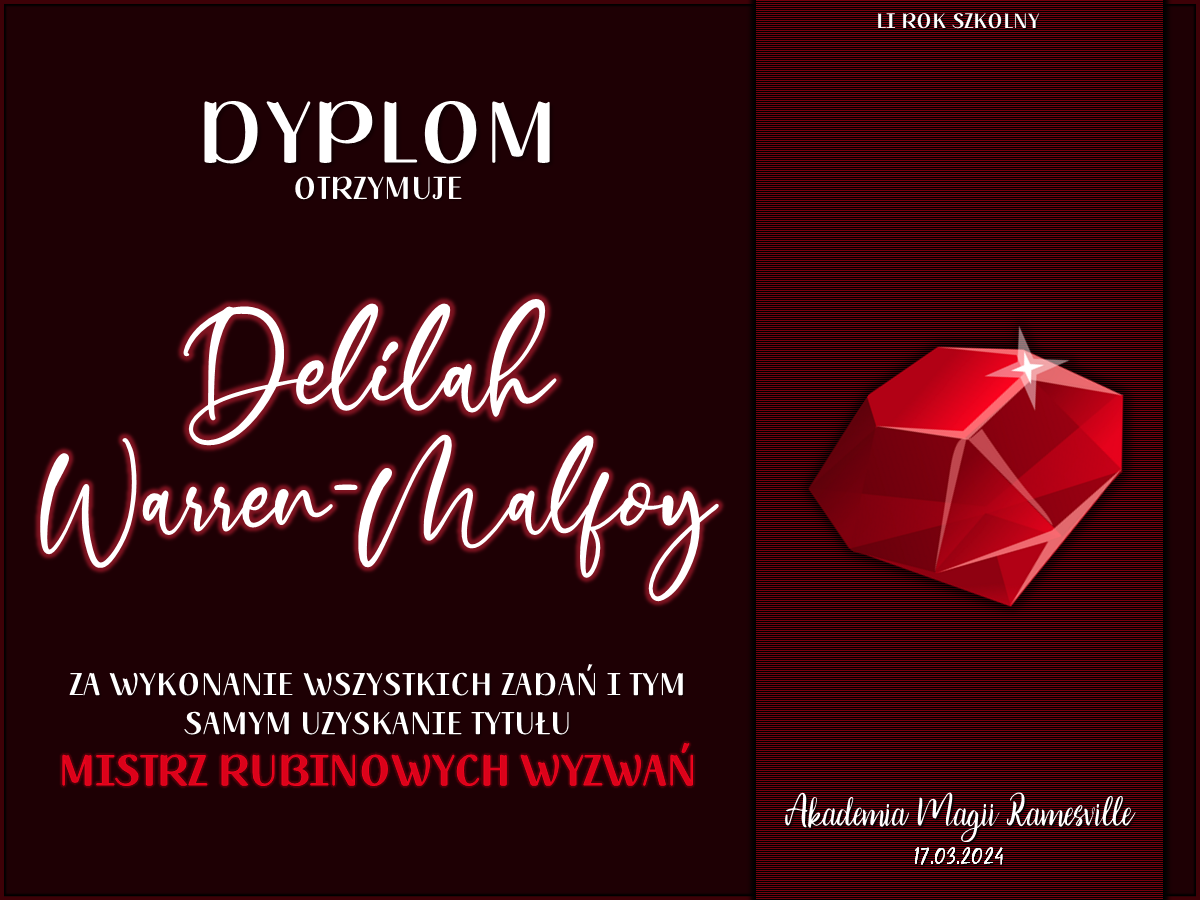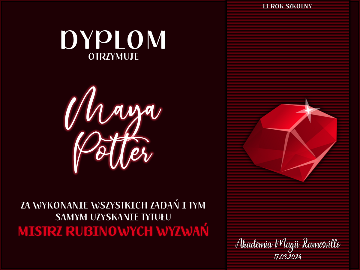 Ponadto każda osoba, która podjęła się wzięcia udziału we wszystkich Rubinowych Wyzwaniach otrzymuje tytuł Mistrza Rubinowych Wyzwań.