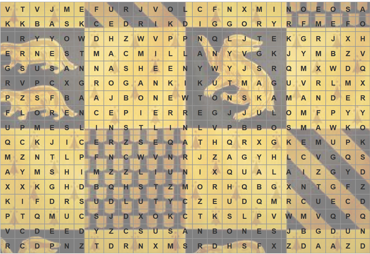 Przyszedł czas na mój konkurs, który jest bardzo prosty (według mnie). Jako, że jestem Prefektem Domu Helgi Hufflepuff to właśnie z nim będzie związany! Waszym zadaniem na sam początek to znalezienie w wykreślance pięciu dawnych prefektów Hufflepuffu z Akademii Magii Ramesville oraz pięciu byłych uczniów Hufflepuff z Hogwartu. Dodatkowym utrudnieniem jest brak spacji pomiędzy danymi, jednak na pewno dacie sobie z nimi radę.