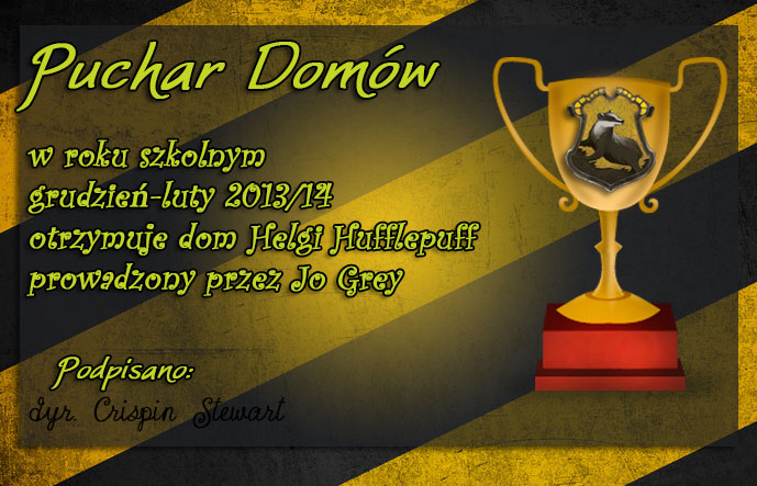 W tym roku szkolnym dom Helgi Hufflepuff pod pieczą profesora Crispina Stewart oraz profesor Ysabel Manesent wywalczył Puchar Domów. Niezwykle pracowici Puchoni uzbierali aż 27428 punkty ustanawiając jednocześnie nowy rekord szkoły. (PUCHAR)