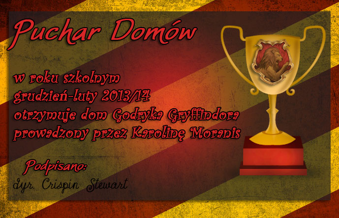 Puchar Domów trafił po raz pierwszy w historii szkoły do Gryffindoru, prowadzonego przez profesor Karolinę Moranis (Gleinert)! Gryfoni zdobyli aż 3728 punktów. (PUCHAR)
