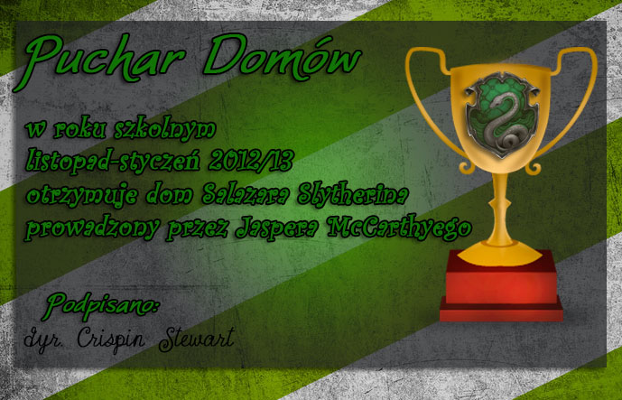 Uczniowie z domu Salazara Slytherina już po raz czwarty zatrzymali puchar w swoim posiadaniu. Zdobyli oni w ciągu roku 1761 punktów. Ślizgonów do zwycięstwa poprowadził profesor Jasper McCarthy! (PUCHAR)